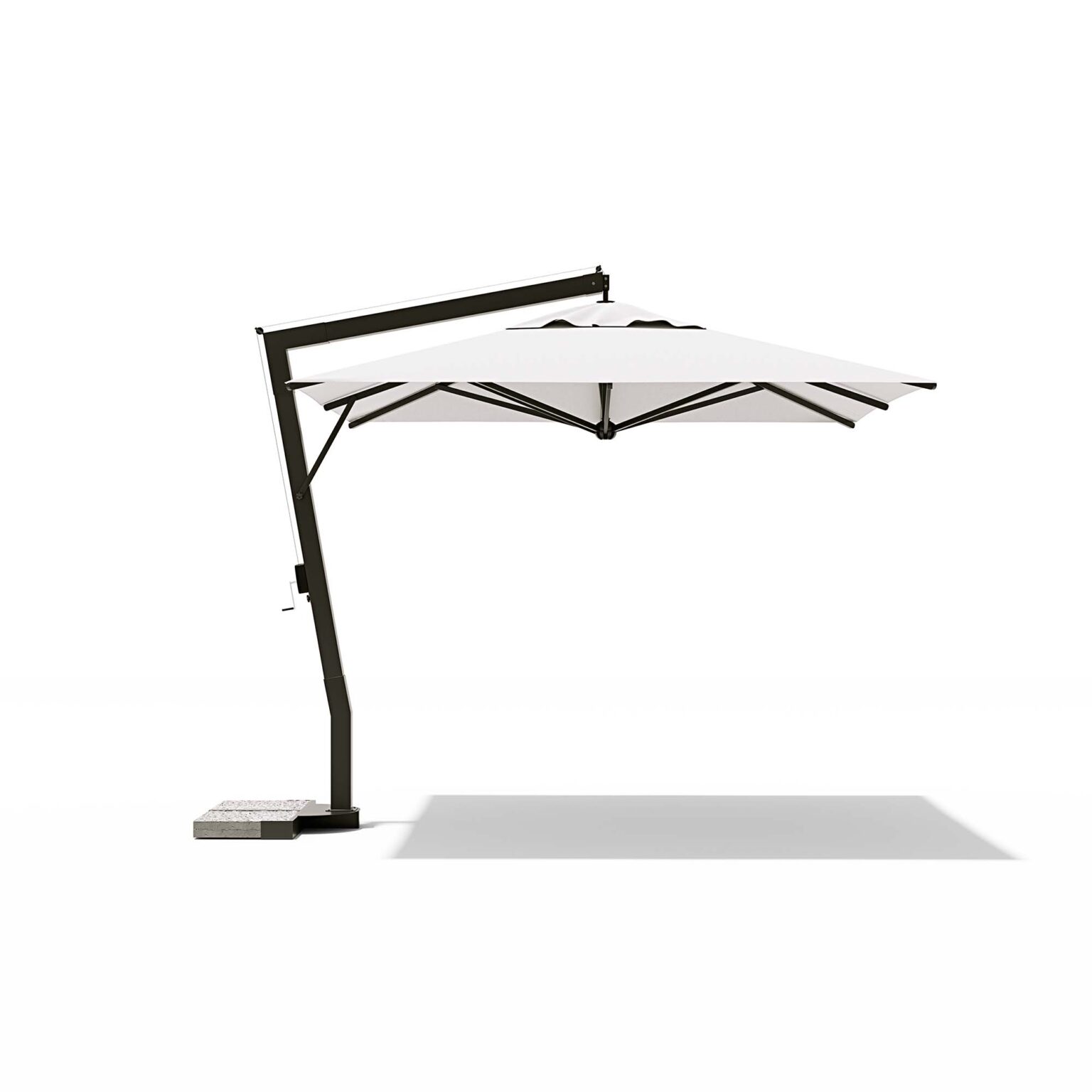 Aluminium frame painted grey or white. Acrylic fabric gr. 320 in white or ecrù, complete with wind vent, opening winch. 360 ° swivel. Steel base plates.