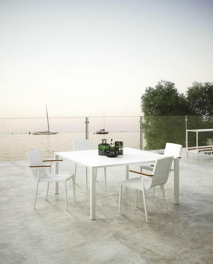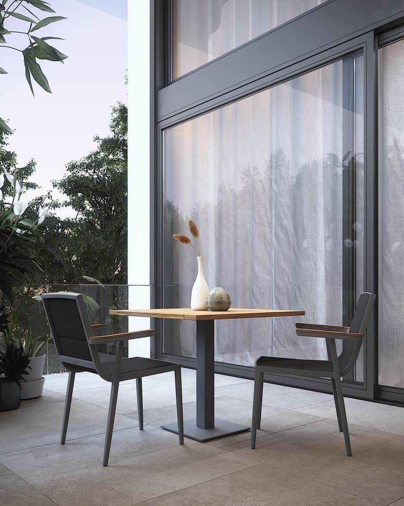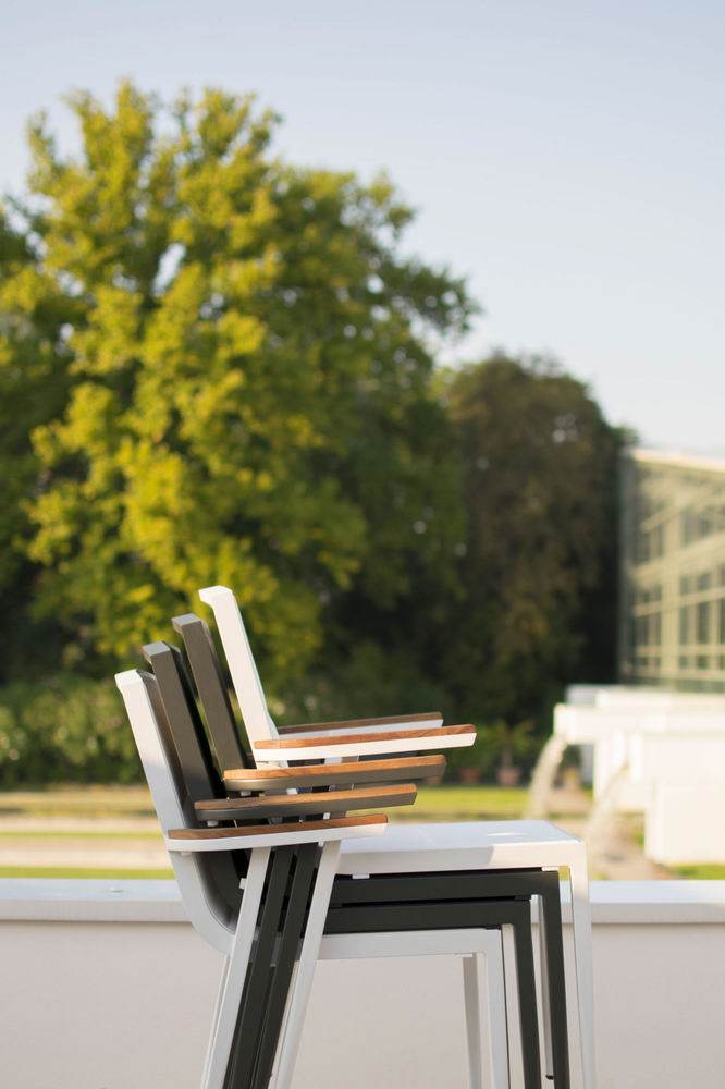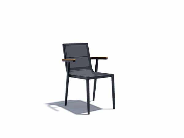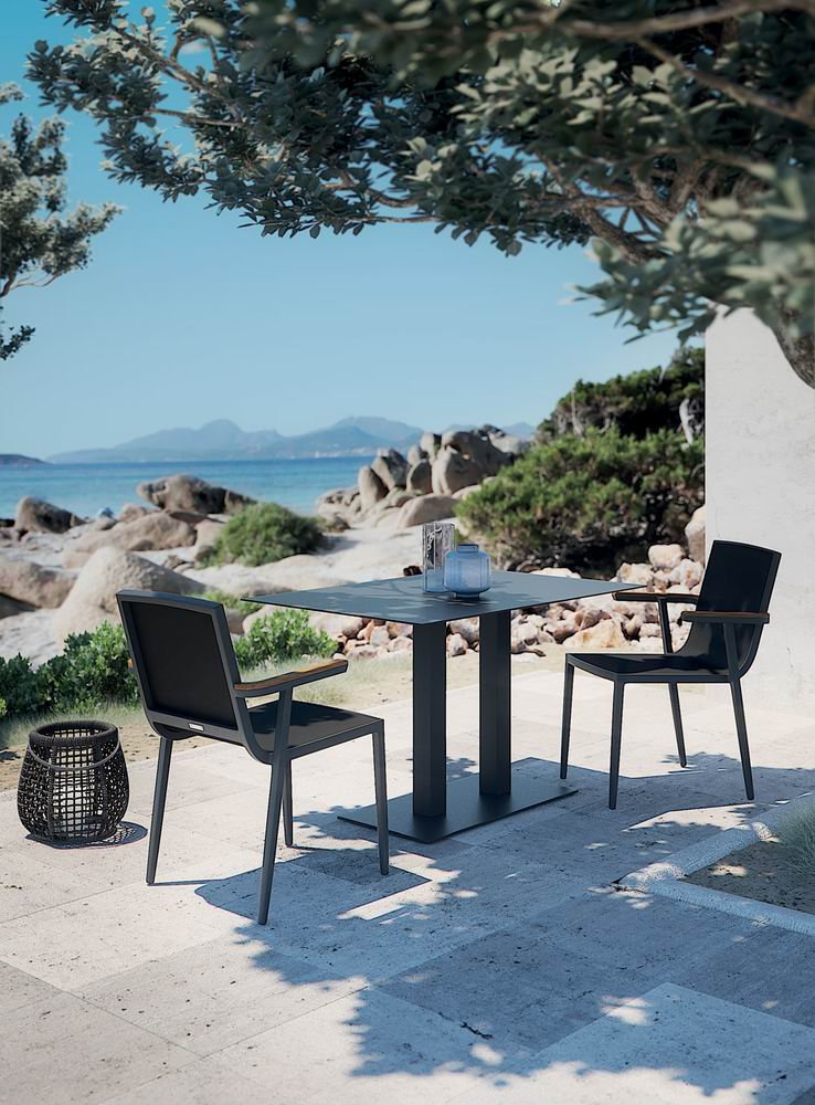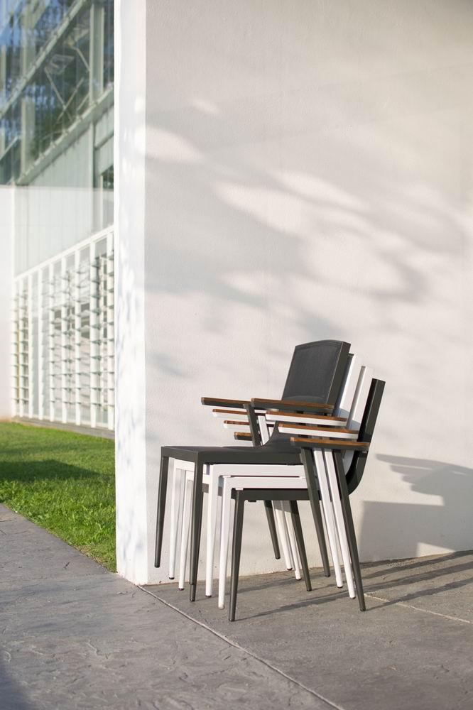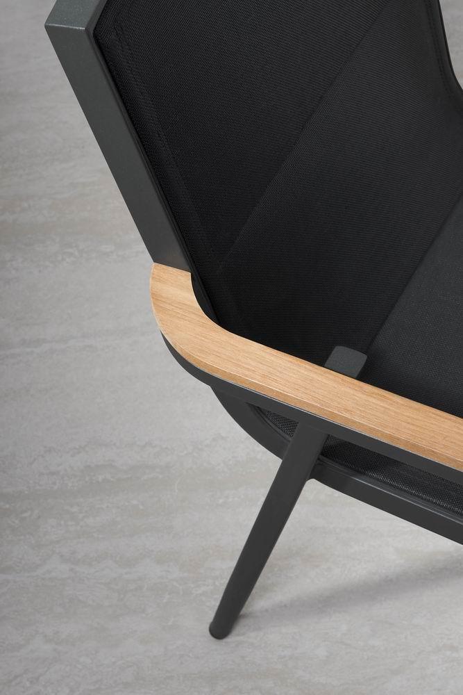 The straight lines of the aluminum frame contrast with the curved textilene seat. Teak inserts offer a refined and timeless design.