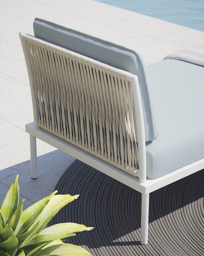 Flash is the modular sofa characterized by the hand-woven ropes in thermoplastic acrylic Teflon fiber, water-resistant and easy to clean. The material has a soft appeal and refined like textile weaves. It is characterized by its resistance to UV rays and to its drying speed. The finishes colors are ivory white and melange gray, with sandy-colored filaments.