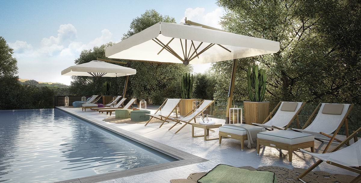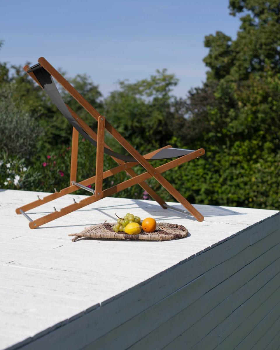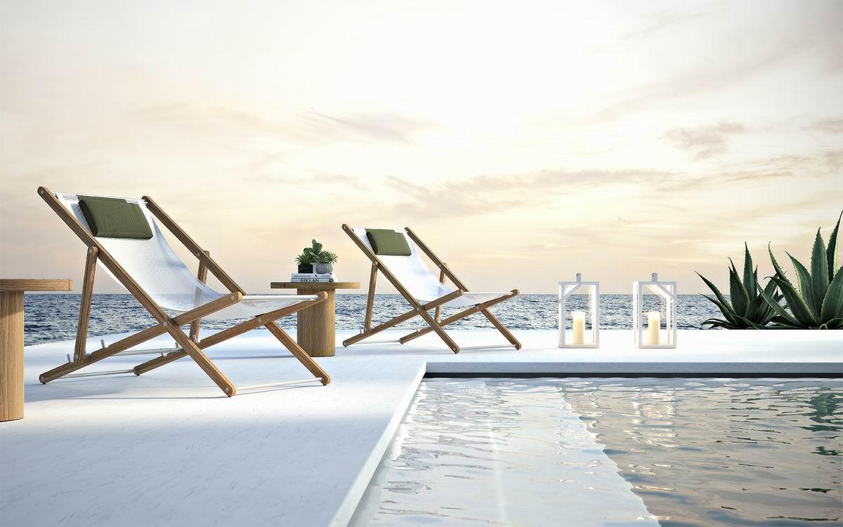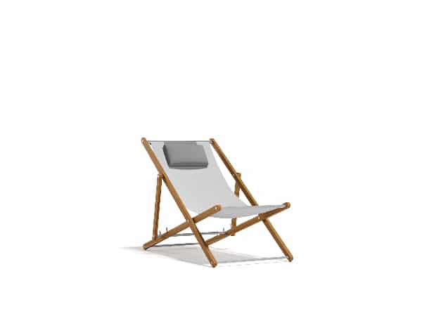 Solid Asian TEAK frames, with oil finish; details in brushed steel finish. Seat fabric and micro heat sealed for outdoor textilene white. Backrest adjustable in 4 positions.