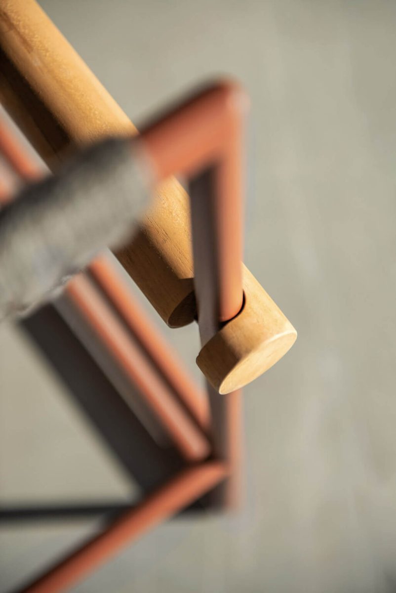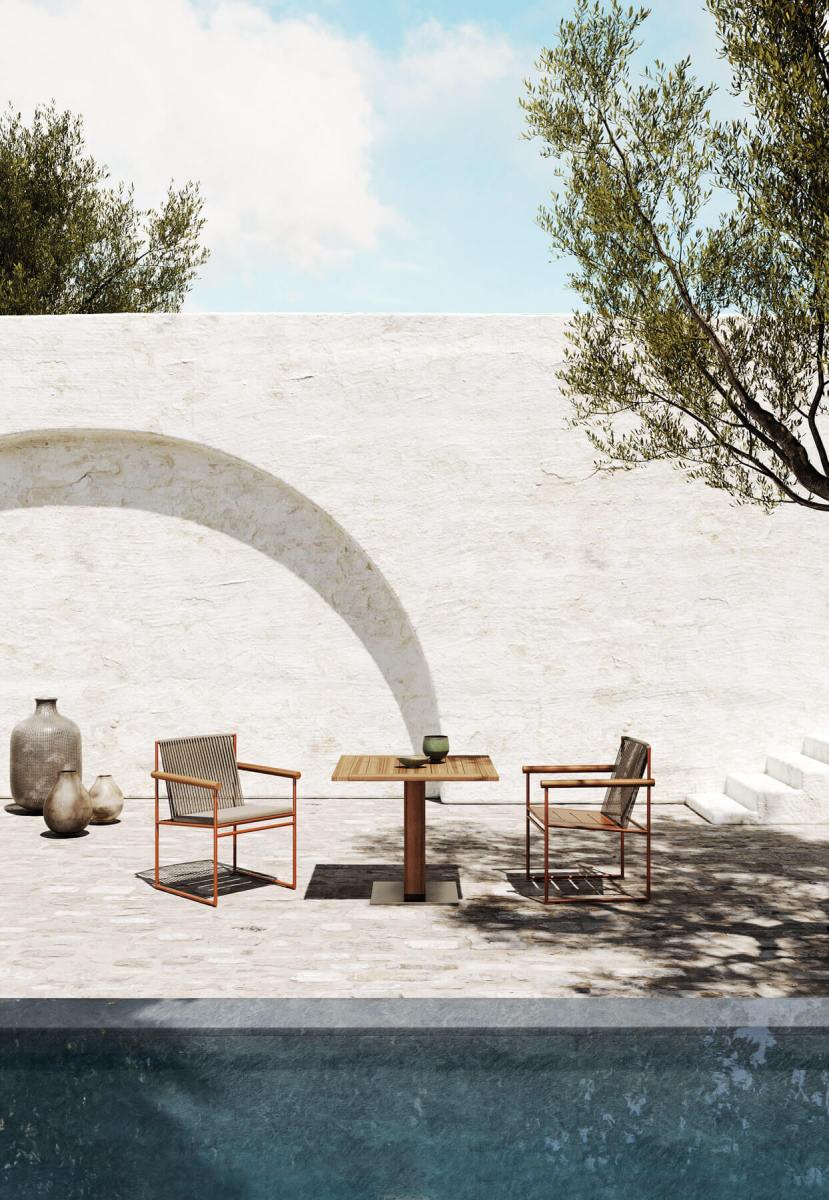The structure’s minimal design is balanced by the warmth conveyed by the distinctive cylindrical Teak wood armrest, protagonist and fil rouge of the collection, and by the braided ropes that make up the backrest and support the cushions.