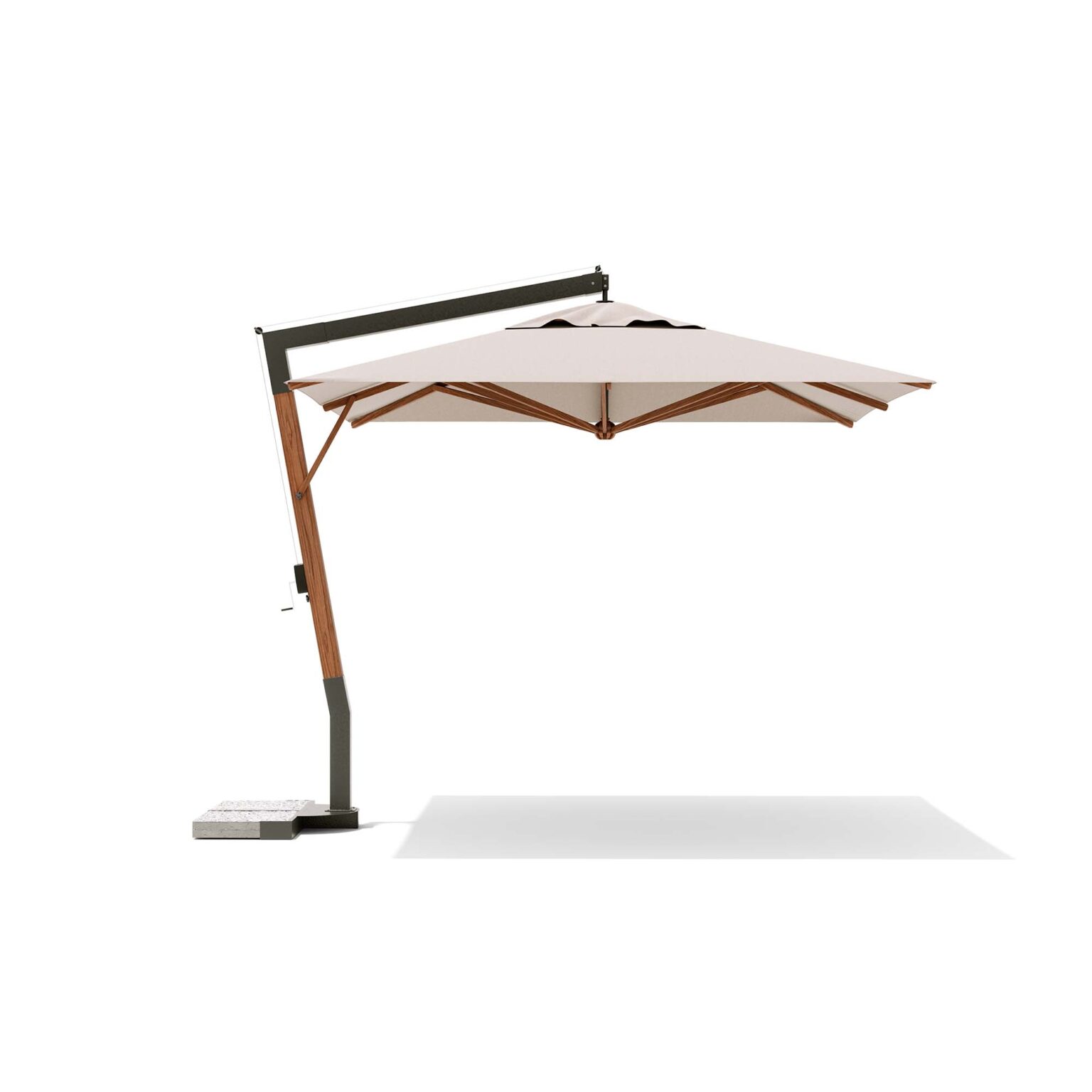 Vertical pole in Iroko. Horizontal pole in grey aluminium, steel components galvanised and painted. Acrylic fabric gr. 320 in white or ecrù, wind vent, opening winch. 360 ° swivel. Steel base included.
