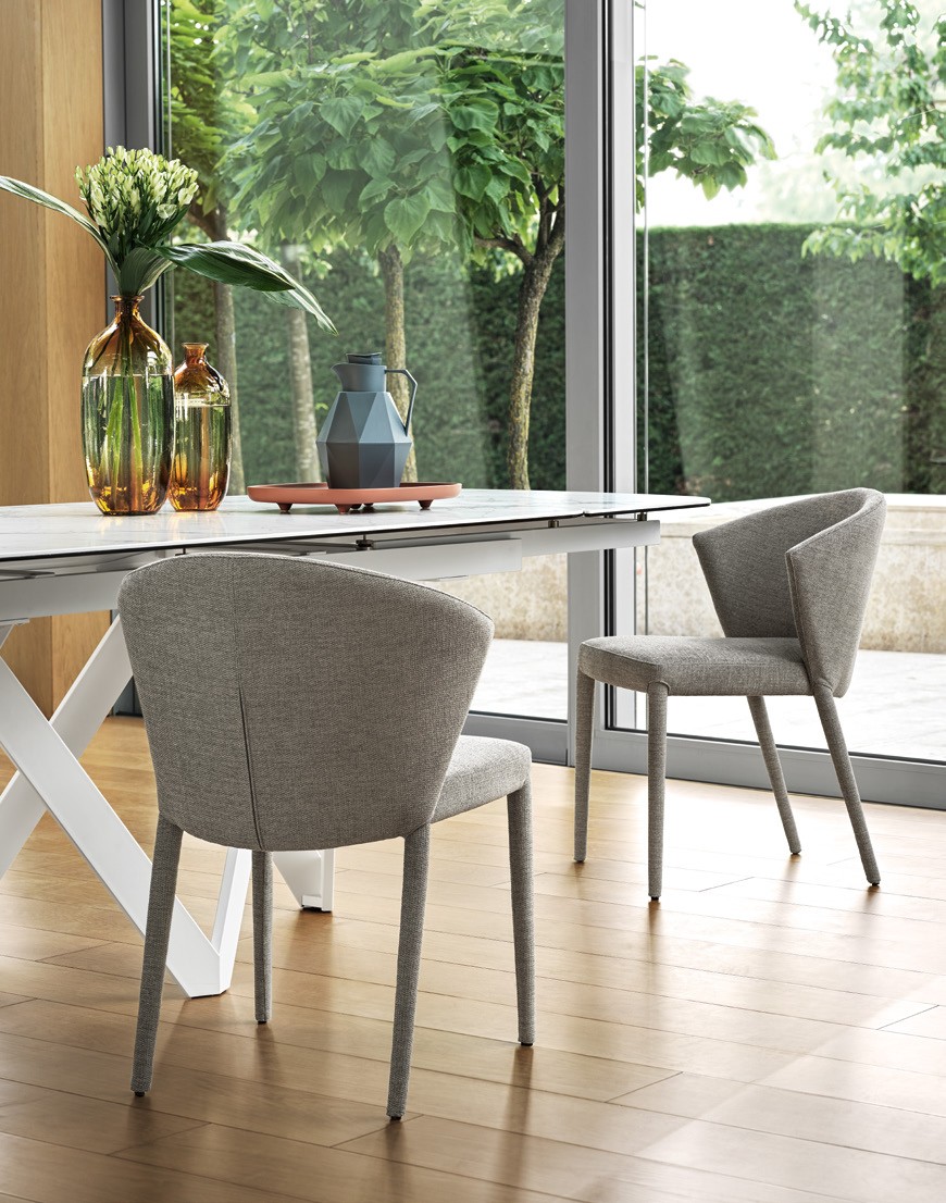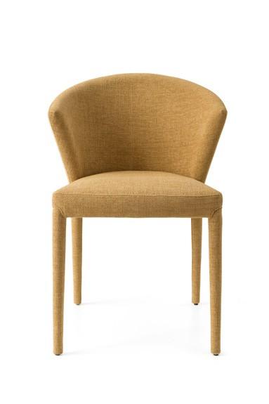 AMÉLIE model chair, with wooden frame and upholstered shell. AMÉLIE is a chair with smooth lines, and a unique and contemporary design. The large wrap-around backrest and the seat supported by elastic belts guarantee maximum comfort and softness. A perfect mix of elegance and functionality, the AMÉLIE chair is perfect for decorating the dining room and living area.