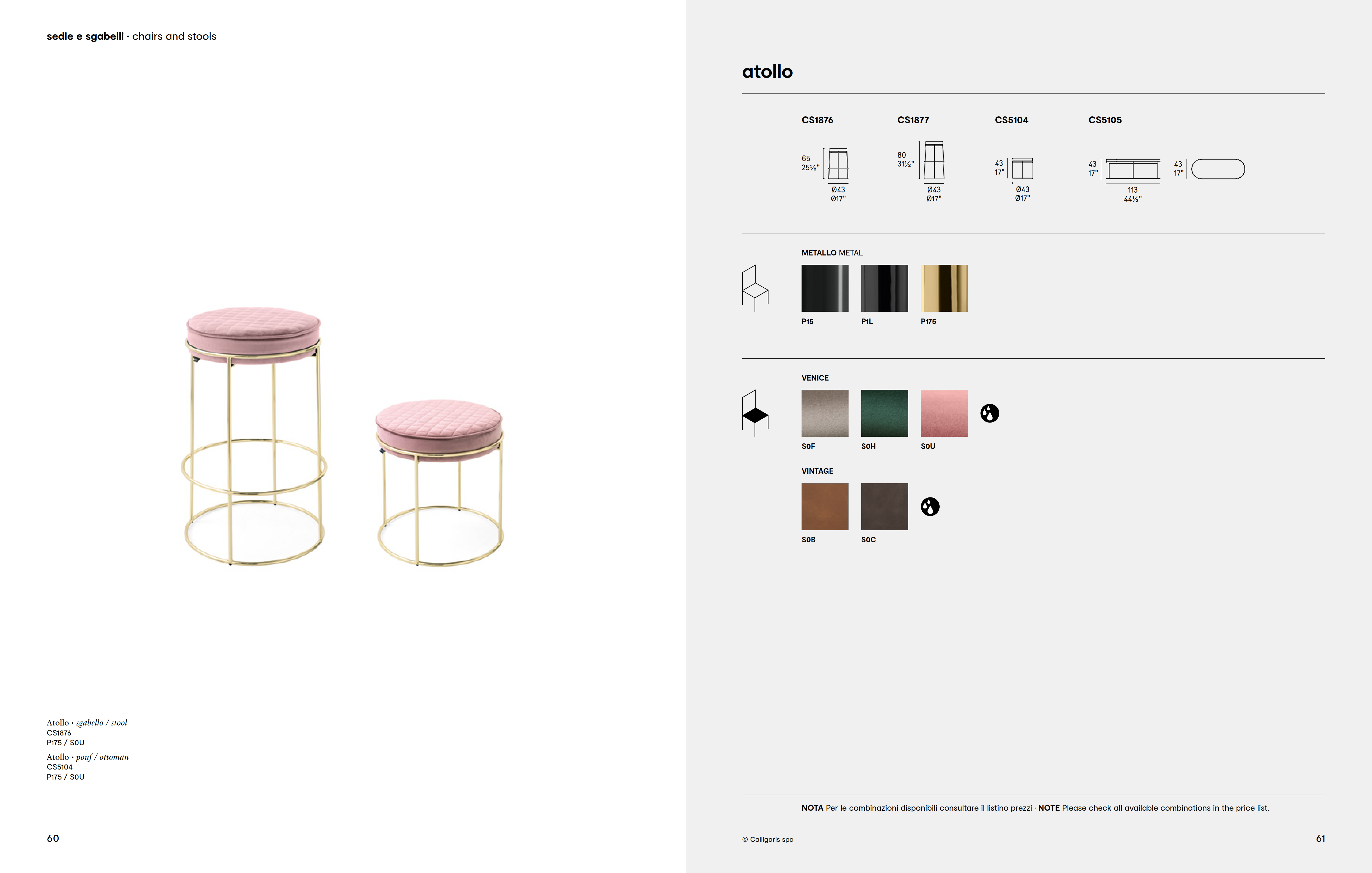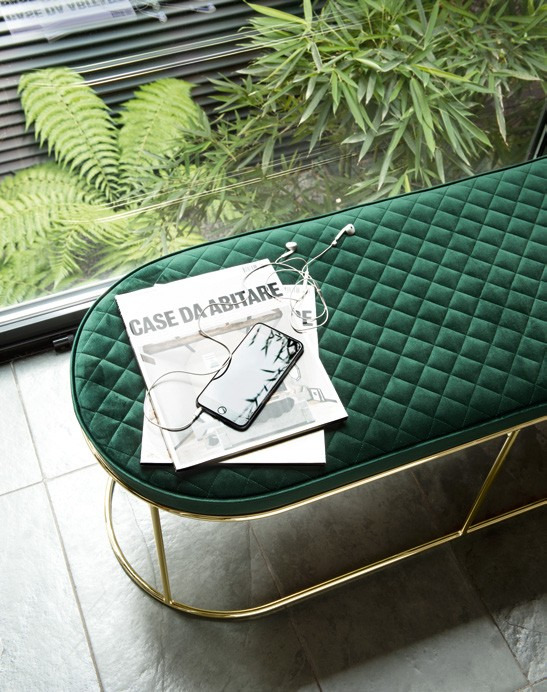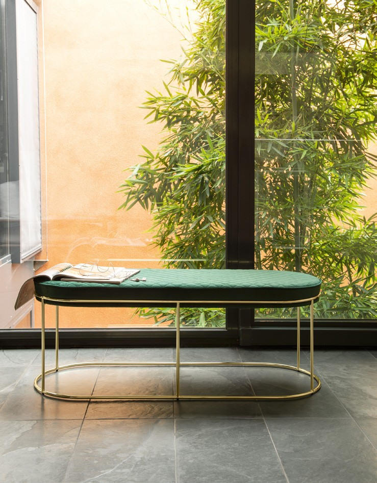 This ATOLLO stool has a metal frame and an upholstered quilted seat in velvet or faux leather. Exuding edgy elegance, Atollo goes to complete the set of coffee tables, benches and ottomans all of which feature a subtly slender metal rim available in a polished brass. With its slick design and harmonious proportions, it adapts seamlessly to individual requirements and fits perfectly into any interior setting.