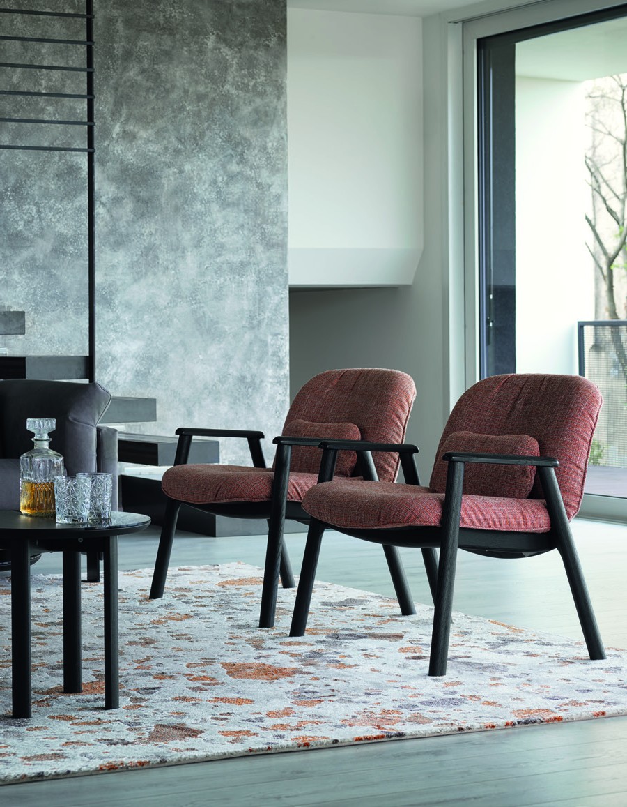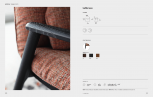 Made with an ash wood frame and a plywood shell covered with a non-removable upholstery, it features an elegant semi-elliptical design on the legs and armrests. The soft upholstery, which grants an aesthetically cozier look, features a small lumbar support pillow in a matching cover and guarantees, for the Baltimora armchair, the utmost seating comfort.