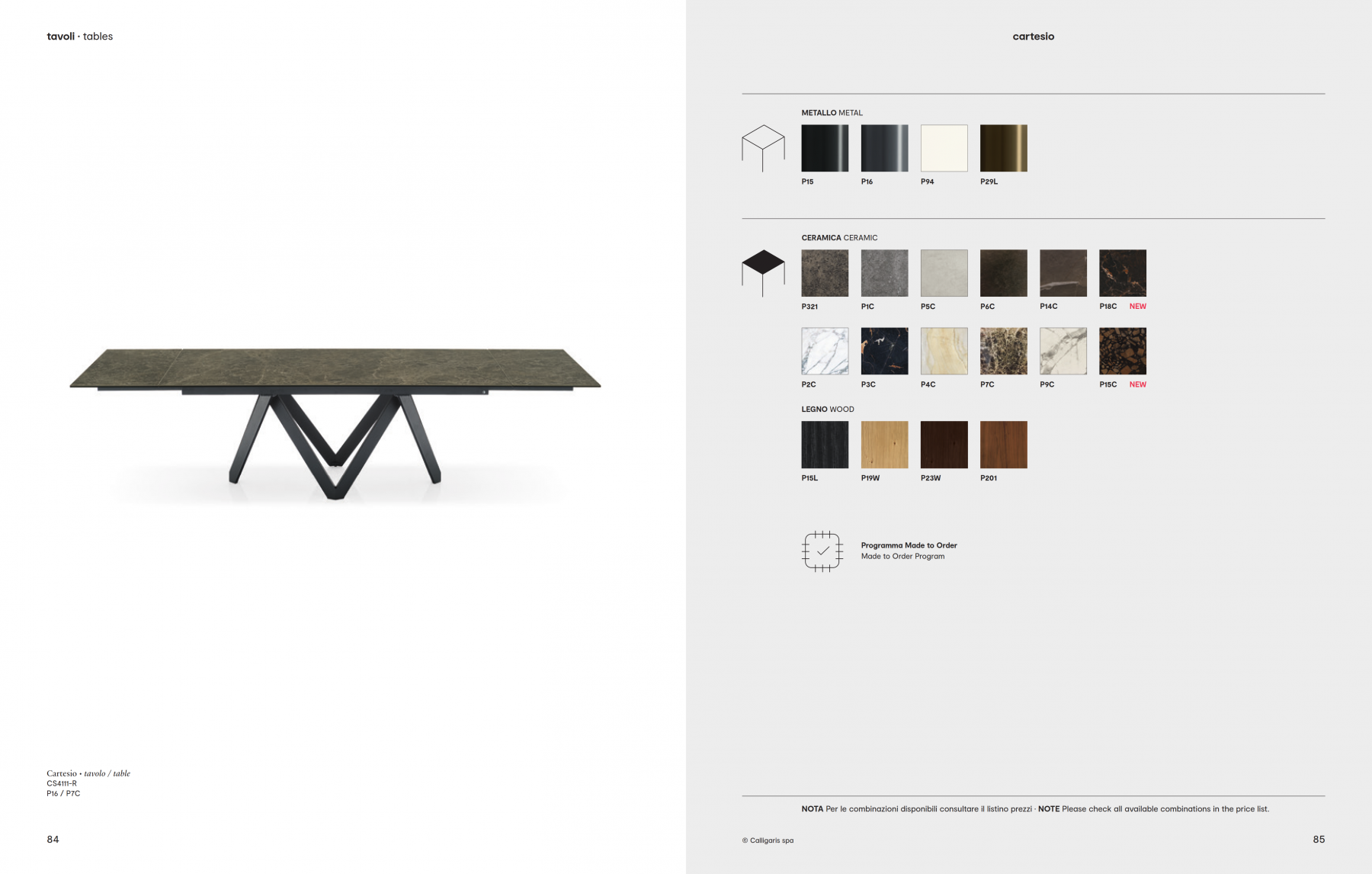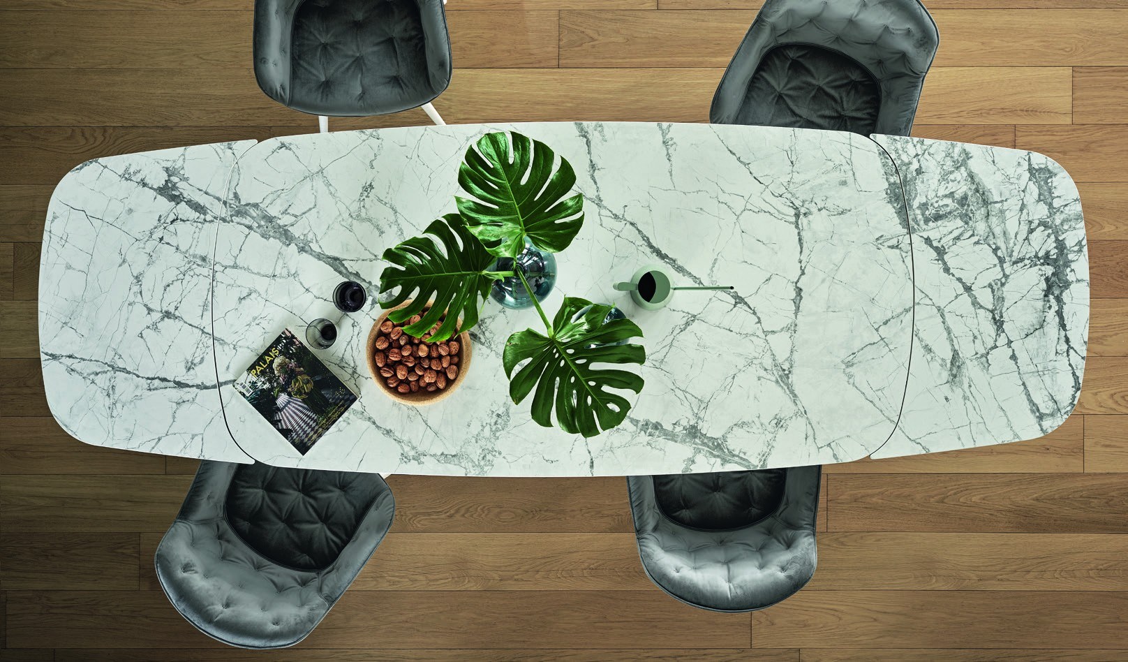 The CARTESIO table boasts elegant, iconic lines characterised by an original weight-bearing frame in painted metal composed of four independent rectangular “V” elements. The top is available in glass-ceramic or wood.