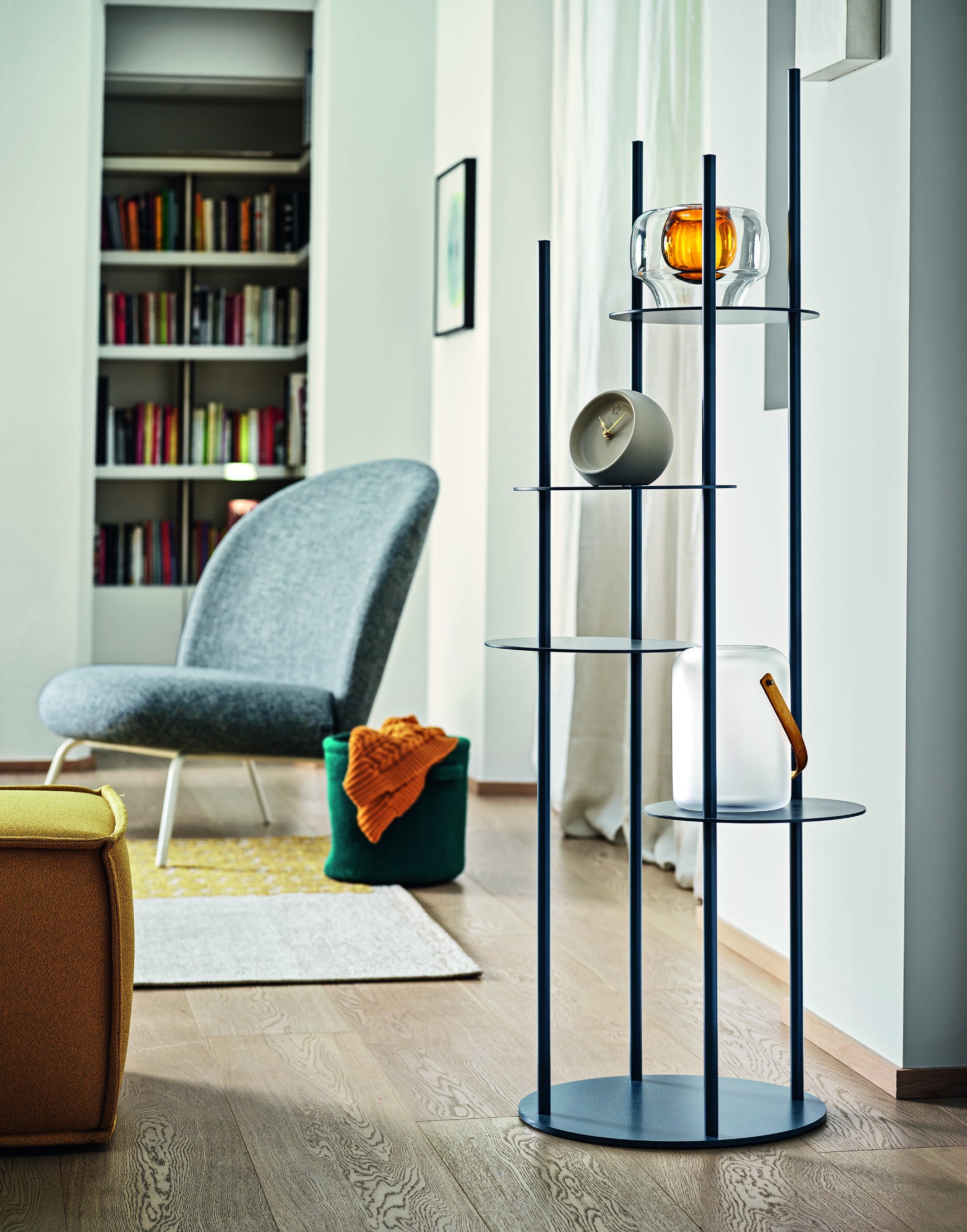 This design piece puts a new slant on furnishing accessories. CIRCLES is a highly original way to keep your most important belongings in view without taking up too much space. This columnar totem in tubular metal has 4 circular metal sheet shelves. Made to match the column, the circular shelves have been placed at different heights and the tubular rods also come in differing heights, creating a visually striking arrangement.