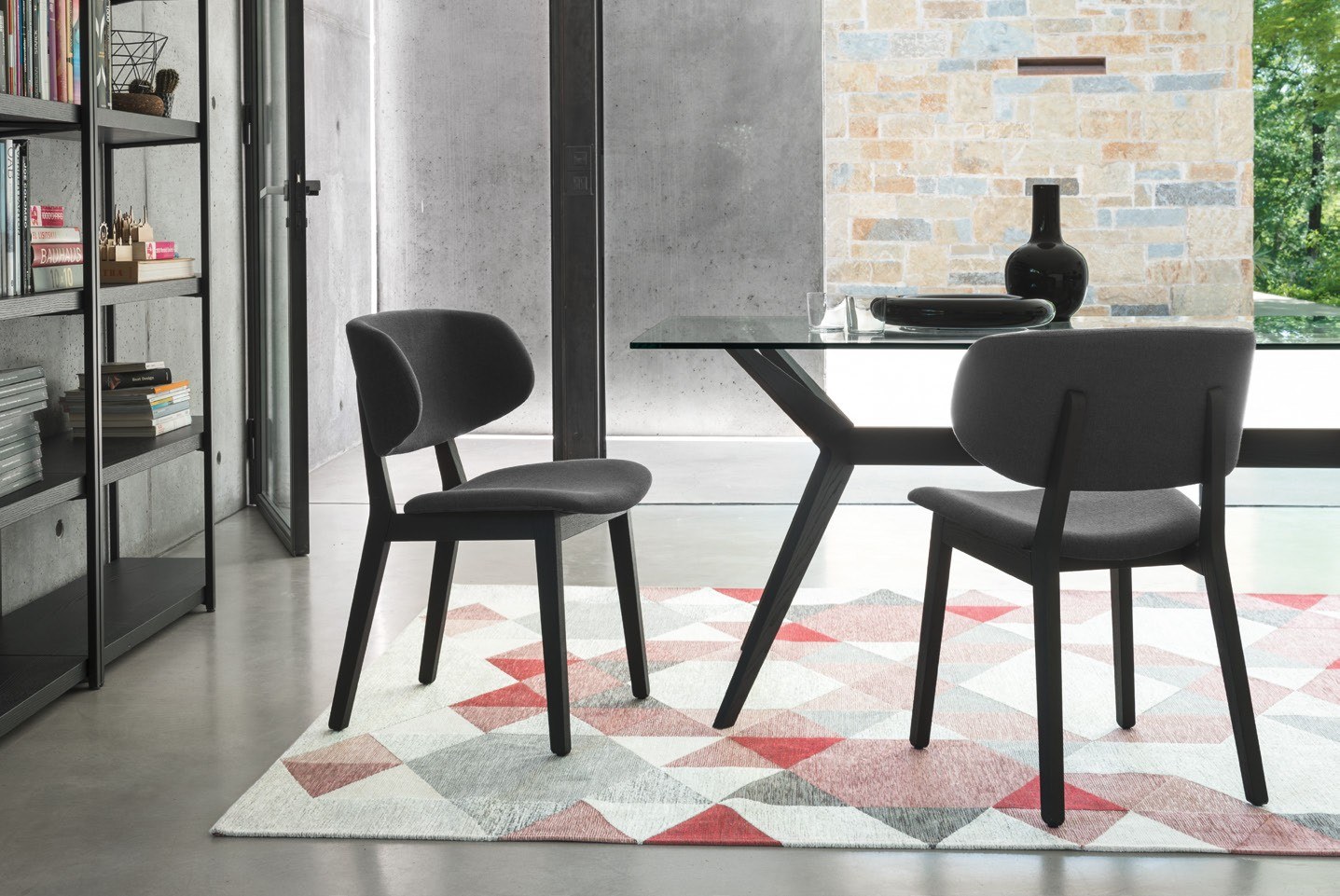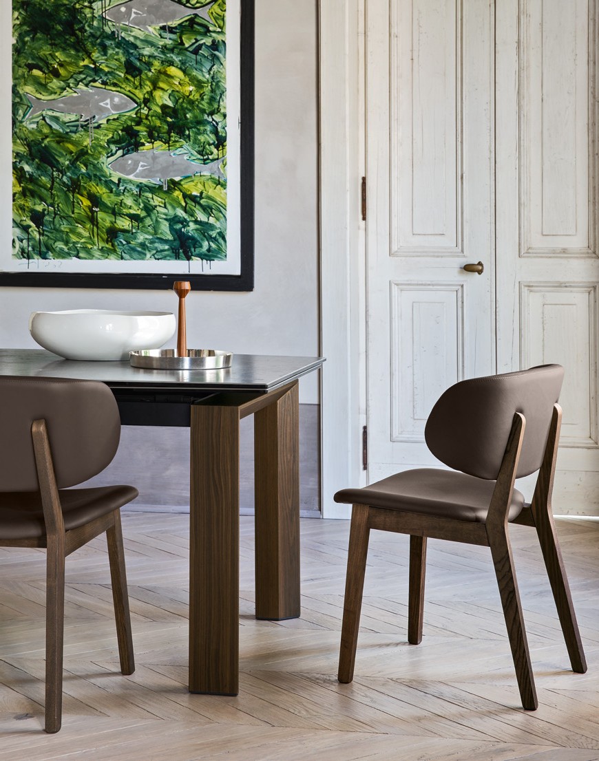 Model CLAIRE chair, with a solid wood frame and upholstered seat. Large backrest. A design with lines that recall the Nordic tradition, for this chair with a wide curved and enveloping backrest. The frame and four sturdy legs are in solid ash wood while the contoured seat and the backrest are upholstered and covered.