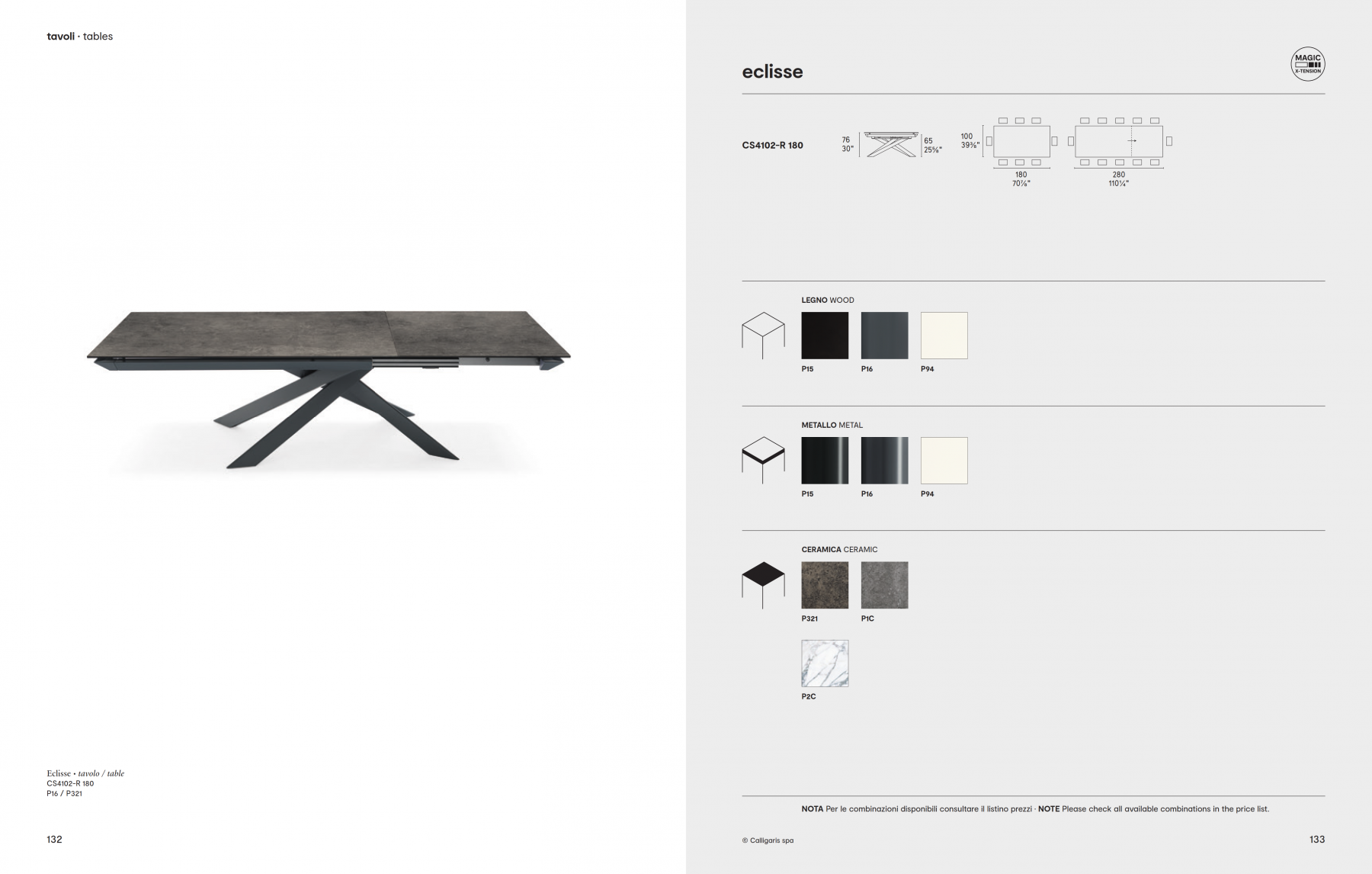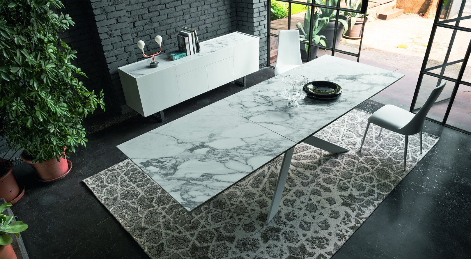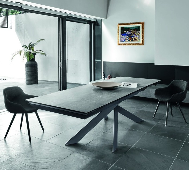 ECLISSE is an extending table with an original metal base consisting of 4 interlocking V-shaped elements, reminiscent of the game Shanghai. It has a solid ceramic top and an automatic extension mechanism so you can have extra space whenever you need it.