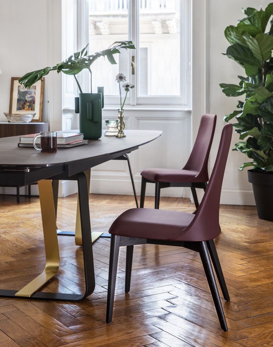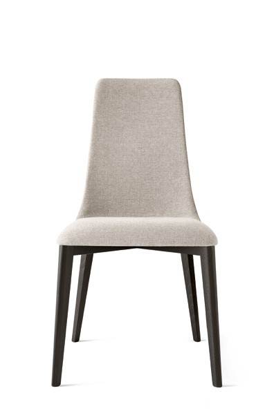 Model ETOILE chair, with a frame in solid beech wood and upholstered and covered seat/backrest. The use of state-of-the-art processing technologies has made it possible to produce a contoured shell in cold-foamed polyurethane, a material that preserves its characteristics over time. Given the wooden legs, for the dining area we recommend pairing the chair with a table of the same material.