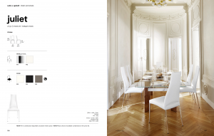 Model JULIET chair, with a metal base and upholstered seat. The use of steel tubing has made it possible to achieve a light and resistant chair with four very thin rectangular-section legs. The fully upholstered chair, the seat with elastic belts and the high contoured backrest, which has a crescent-shaped opening on the bottom, guarantee maximum comfort.