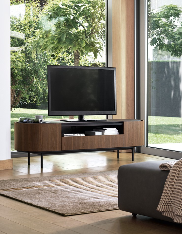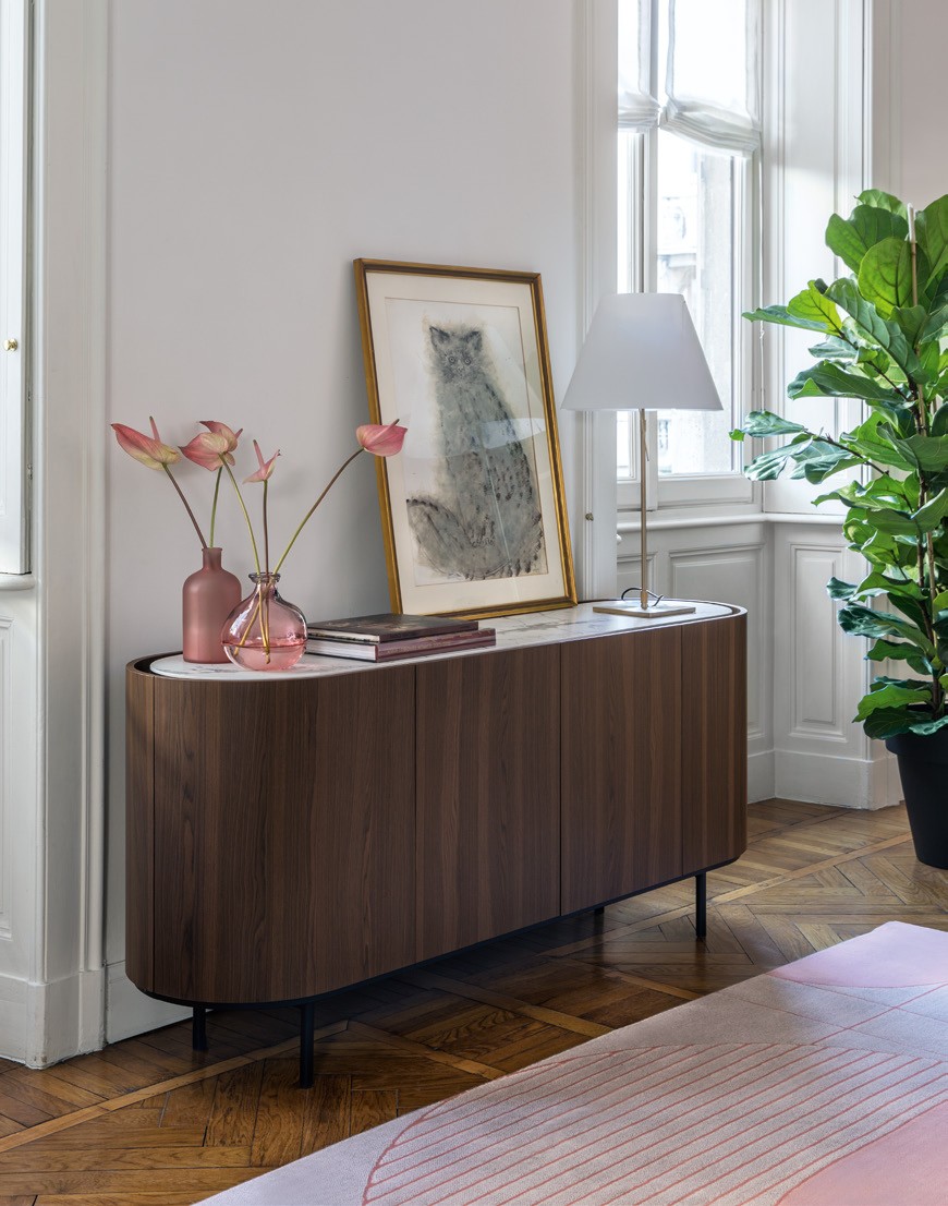 The LAKE sideboard is a living-area piece which stands apart for its sleek harmonious lines. On a raised base, it has an oval shape and its beauty is enhanced by the ceramic top which is slightly set back from the edge, creating a space between door and top which is useful for opening the doors and drawers. This item has been veneered all over, making it ideal for a whole variety of uses.