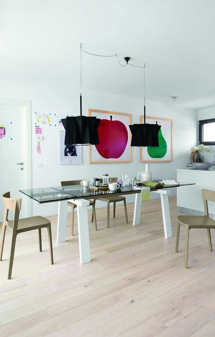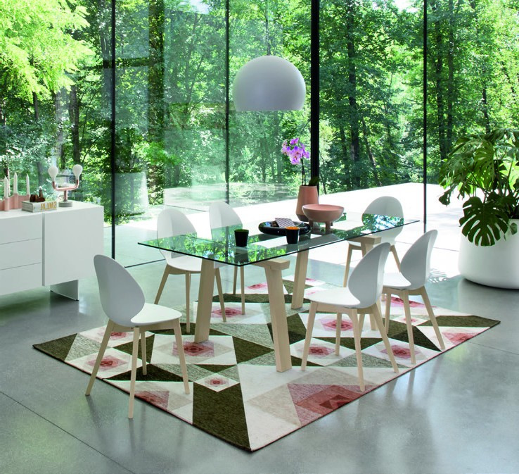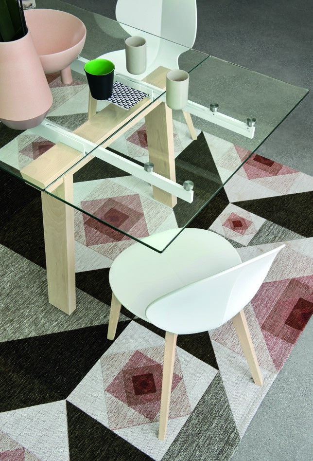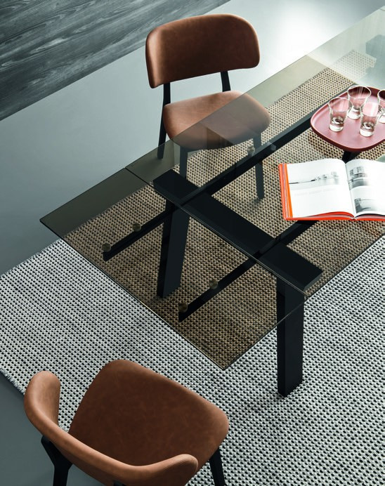 LEVANTE table in mixed materials: wooden base, metal guides and glass top. A table combining the tactile nature of wood with the transparency of the glass top that reveals a touch of colour through the two aluminium guides. An amazing timeless mix that can be easily matched to several chairs in the Calligaris collection.
