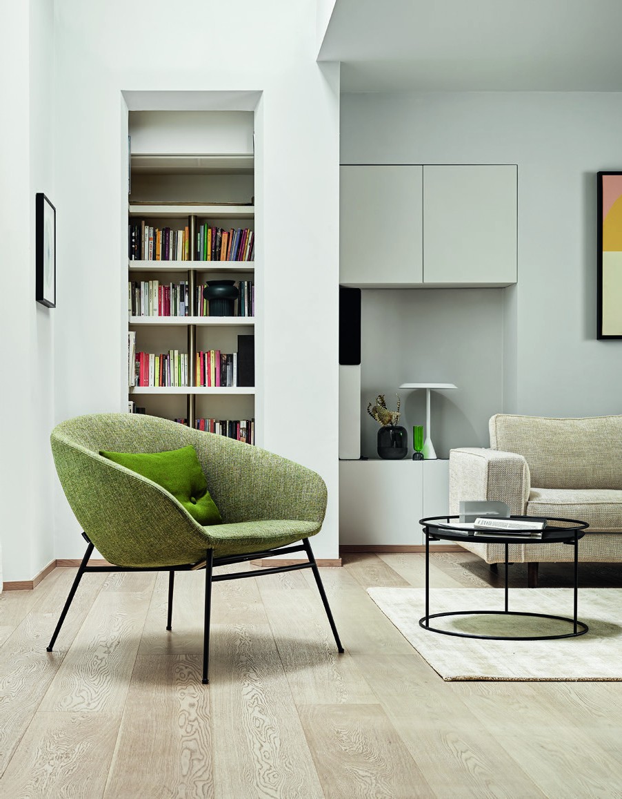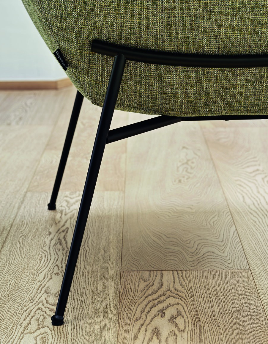 One distinctive detail that unites all the components in the collection is the feature on the backrest which is an elegant extension of the metal legs. This strikingly stylish element bespeaks the unconventional design relationship between the fabric seat and the weight-bearing frame. Its yielding padding and the exquisite detailing on the metal frame make this Love chair into a piece of everyday luxury.