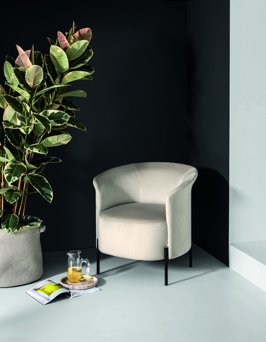 Enticingly soft and elegant lounge armchair. The chair seat has an elastic webbing structure which supports the polyurethane, delivering comfort and durability. The secret behind the slender design and harmonious curves is the backrest made from covered and upholstered cold-foam polyurethane. The structure is set on 4 exposed metal feet with a bottom part in a shiny-brass or black-nickel finish, making for an elegant feel.