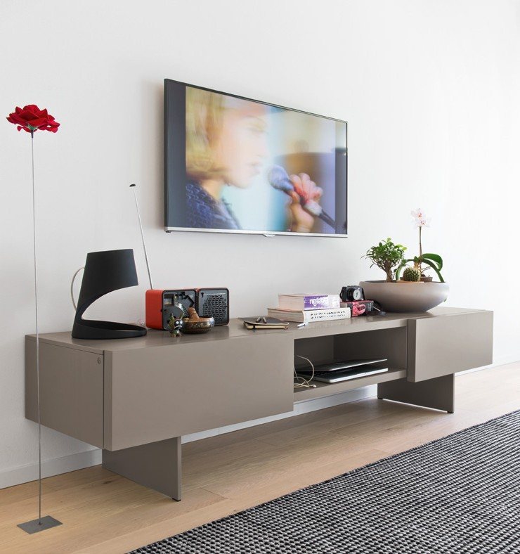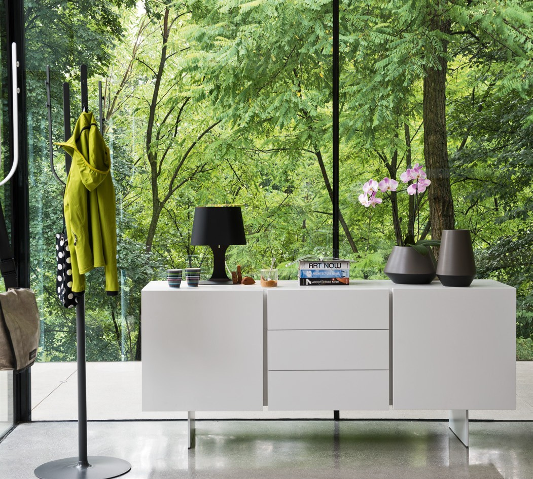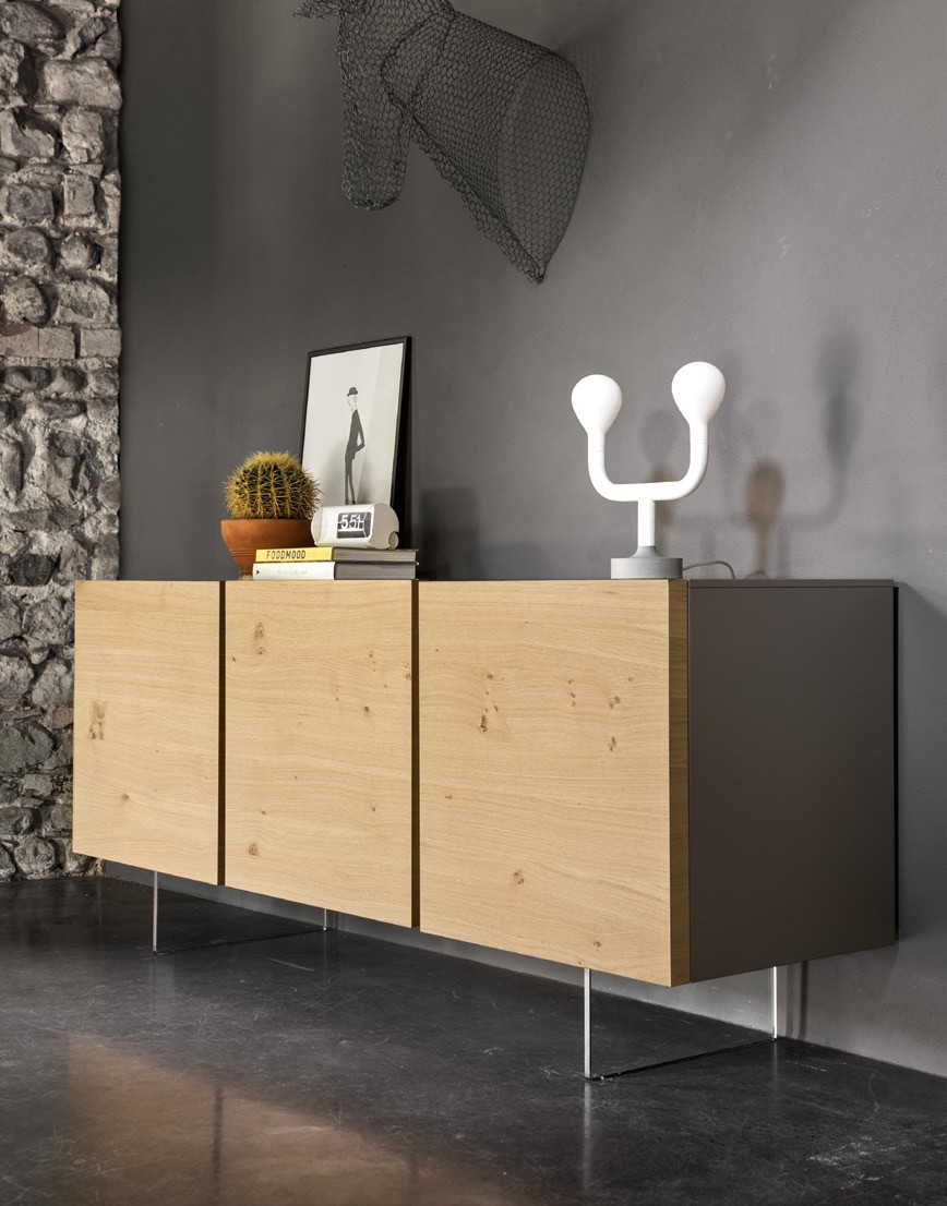 The SIPARIO sideboard is distinguished by its sleek essential design. The 3 handle-less doors, 4 cm thickness, are equipped with a push-pull opening mechanism. The doors come in many different lacquered and veneered finishes.