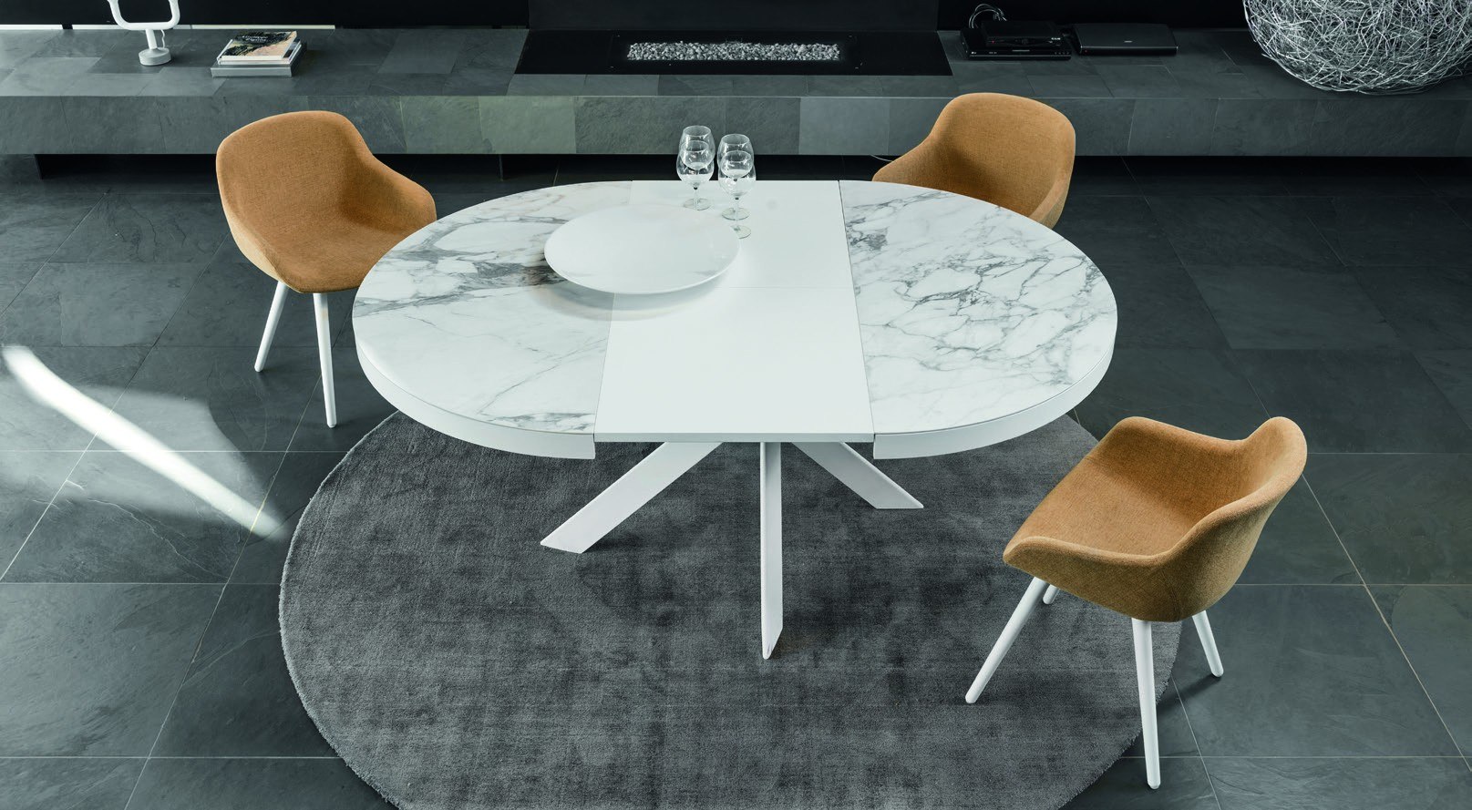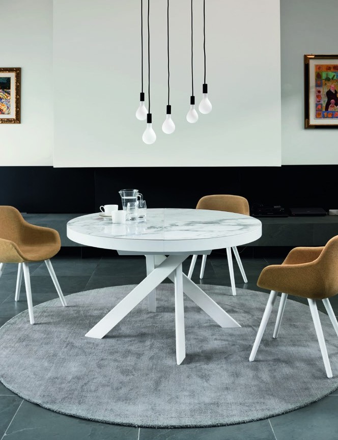 TIVOLI is a round extending table with an original metal base consisting of 4 interlocking V-shaped elements, reminiscent of the game Shanghai. The solid round table top is available in wood or ceramic and can be extended thanks to a central butterfly opening mechanism. TIVOLI will hold centre place in your dining room.