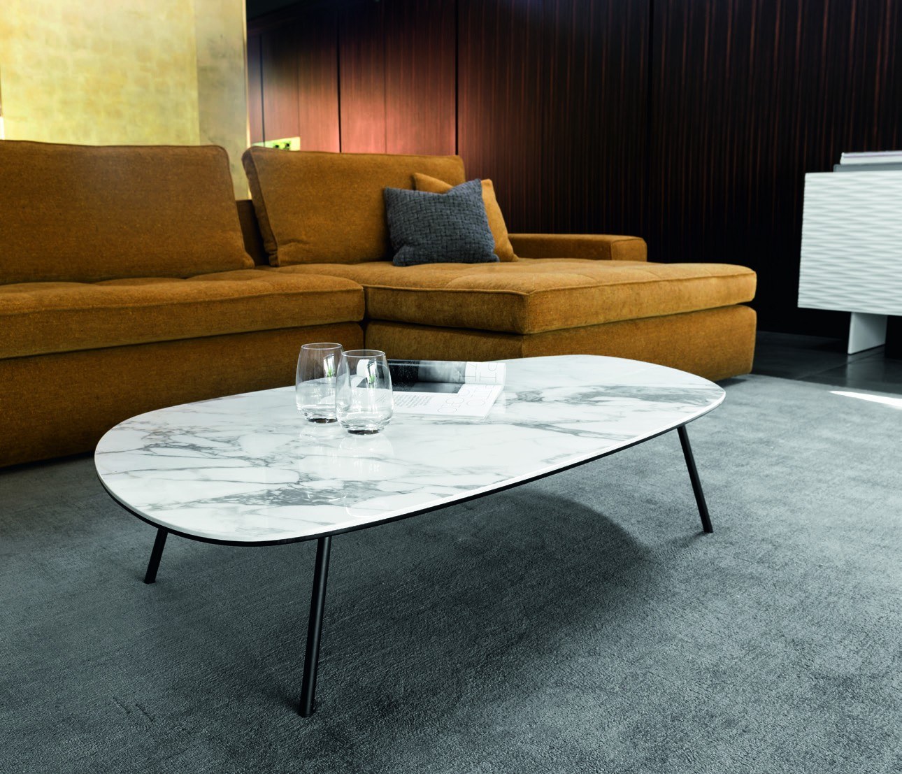 Metal base and two tops available in the veneered wood or in the lacquered finish version; TWEET lives up the living area with its two irregular overlapping tops with curved sides and the same shape and size. They can be freely matched choosing from a wide range of possible finishes (wood or lacquered finish in several colours) to create a unique object for your home.