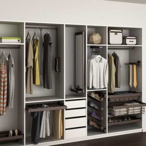 By adding mechanisms, such as a lift, you can make better use of the high sections of the closet, while the LED interior lighting on the one hand makes the closet look much more attractive and on the other hand, makes the process of finding clothes much easier.