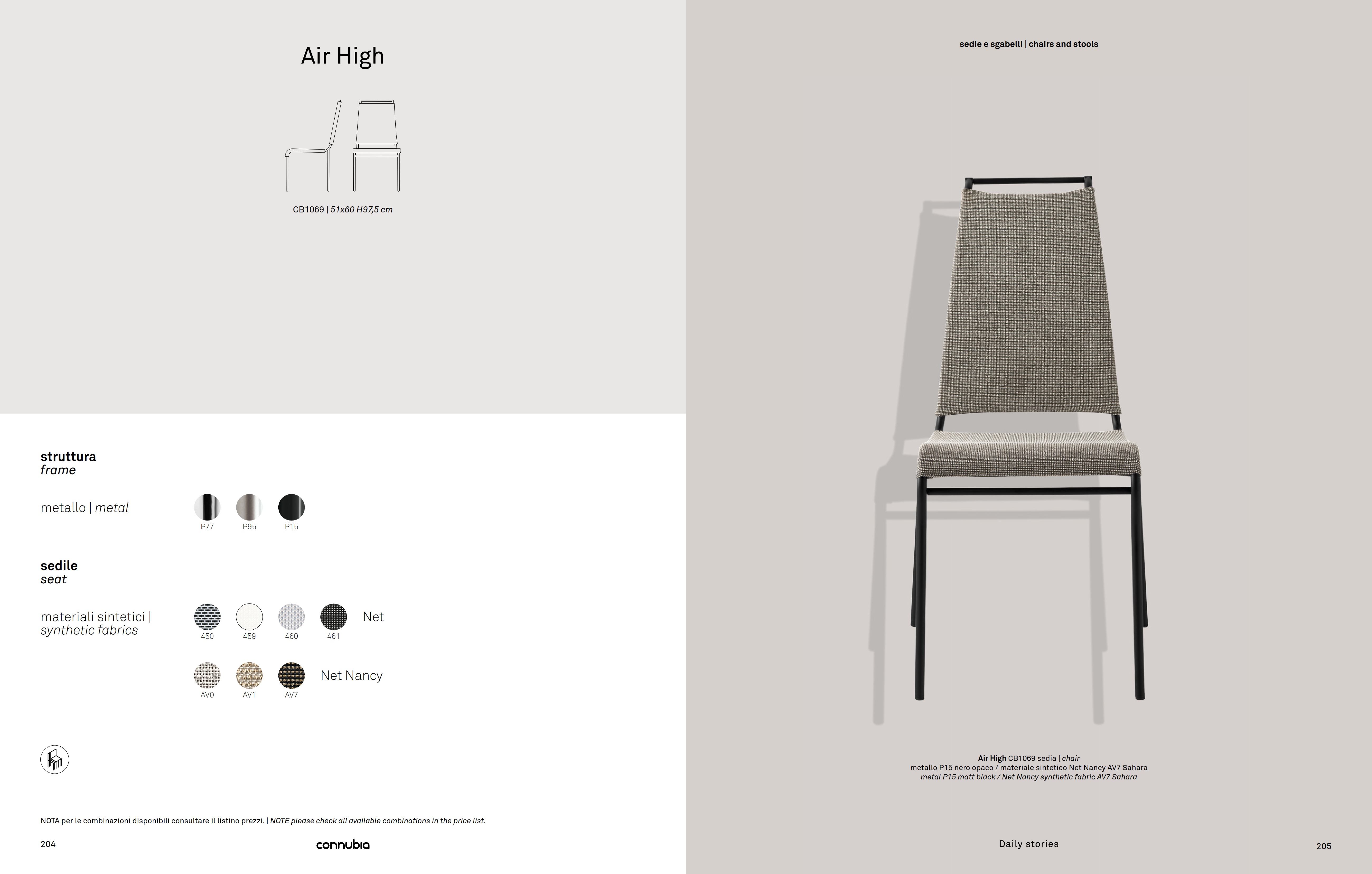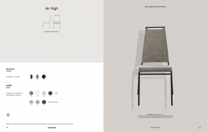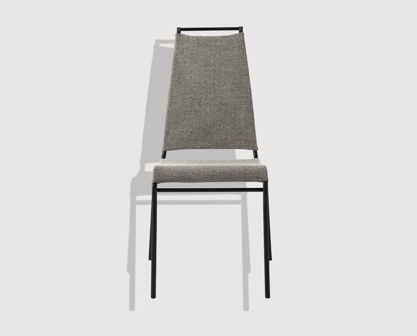Model AIR HIGH chair, with metal frame and seat covered in breathable and washable fabric. High backrest. Stackable up to four chairs high. The use of state-of-the-art materials, such as steel tubing and PVC/polyester NET synthetic mesh, made it possible to achieve a durable, lightweight and easy-to-handle chair. The attention given to the design of the chair’s lines and the high, slender backrest also make it comfortable, ergonomic – the chair facilitates optimum posture in daily use – and design-savvy.