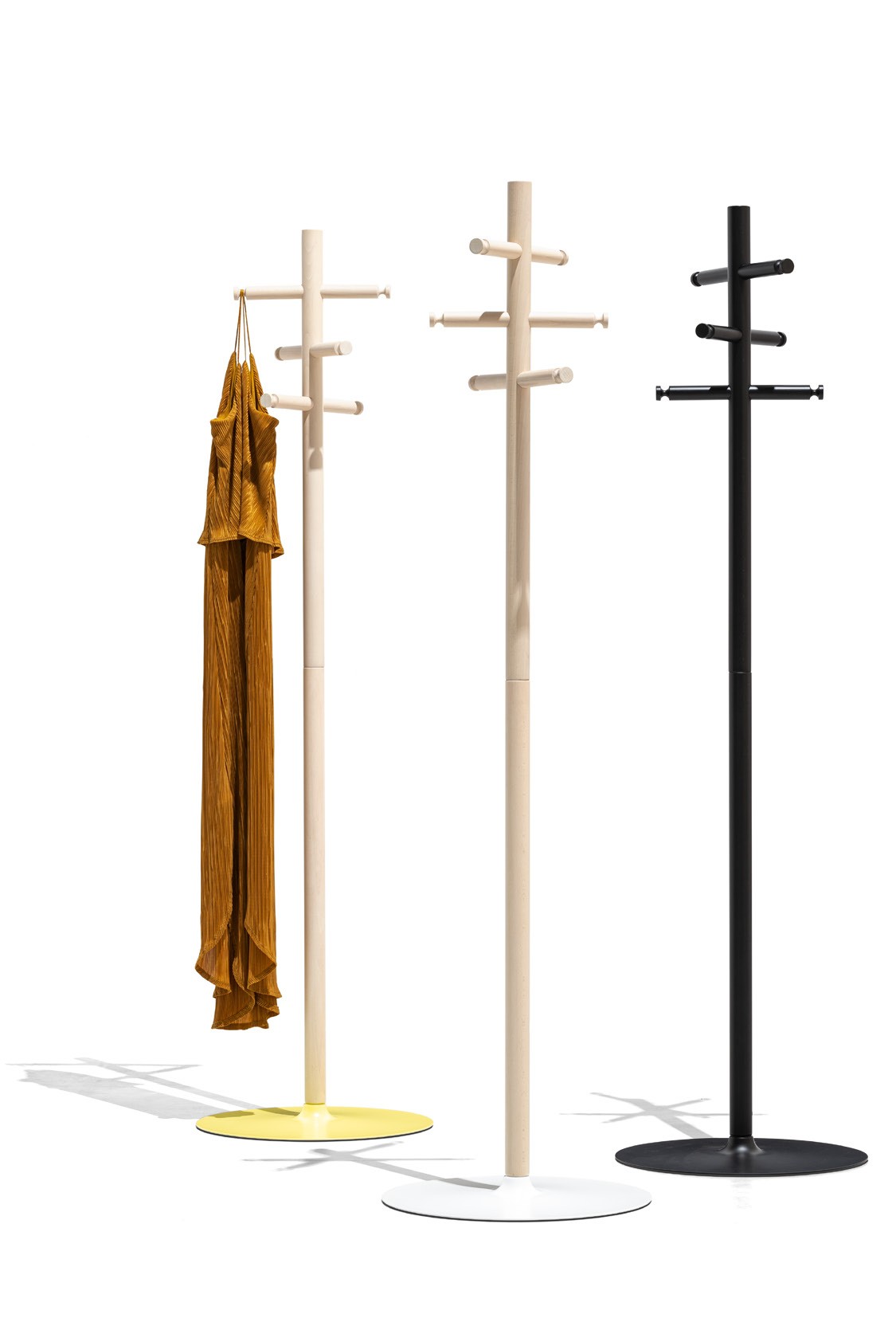Coat hook with weighted base, metal column and hooks in beechwood.