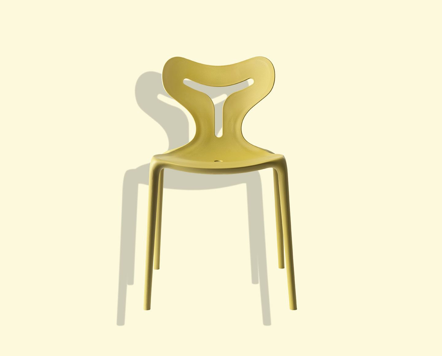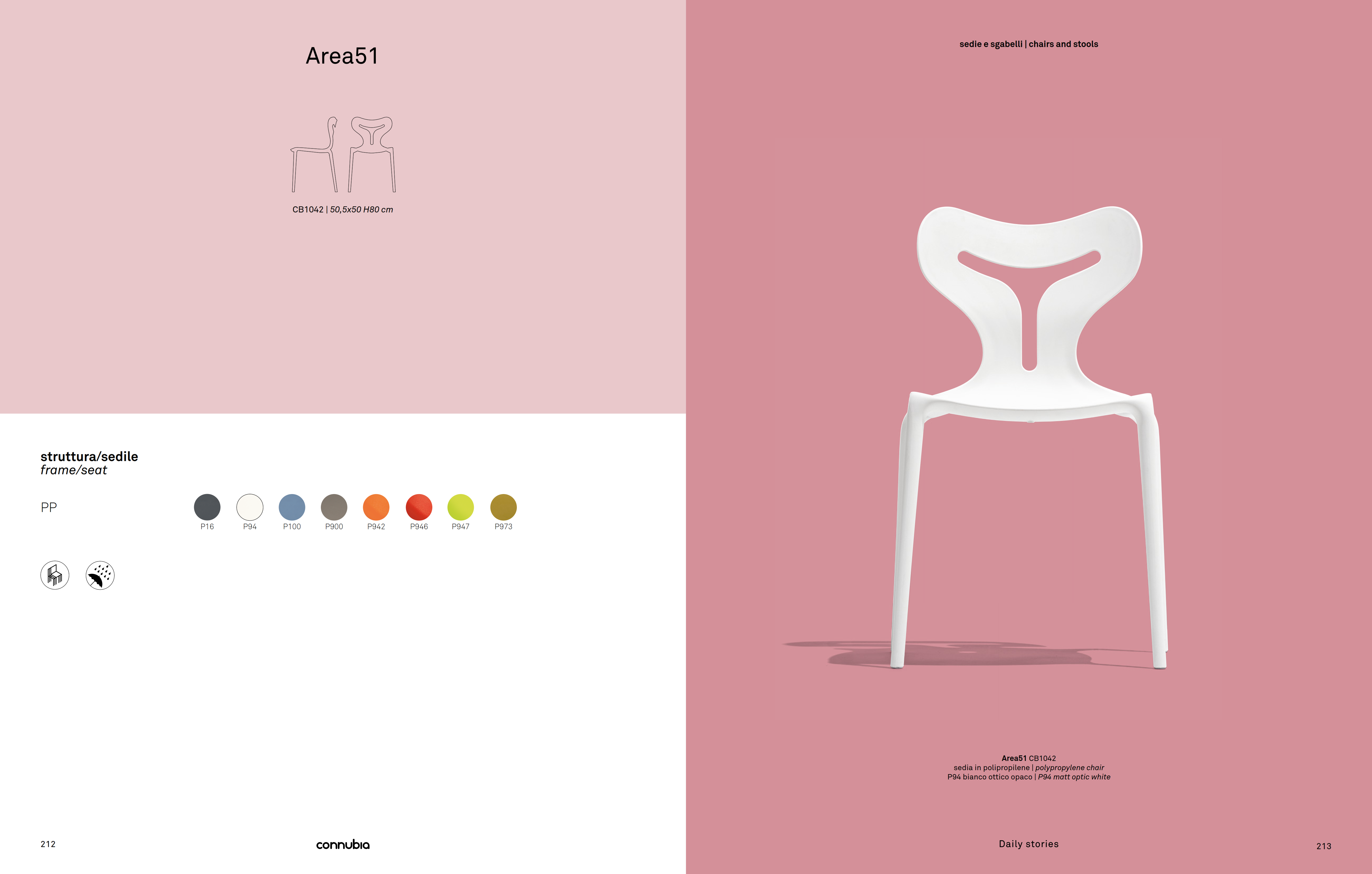 Model AREA51 chair, entirely made of polypropylene, stackable up to 6 chairs high, it is also suitable for outdoor use. The plastic material – polypropylene – and the production technique adopted – AIRMOULDING or injection moulding – helped create a monoblock chair with a surface that is slightly textured – rough to the touch – lightweight but sturdy and suitable for outdoor use. The highly resistant feet are interchangeable, while the hole in the seat facilitates water drainage.