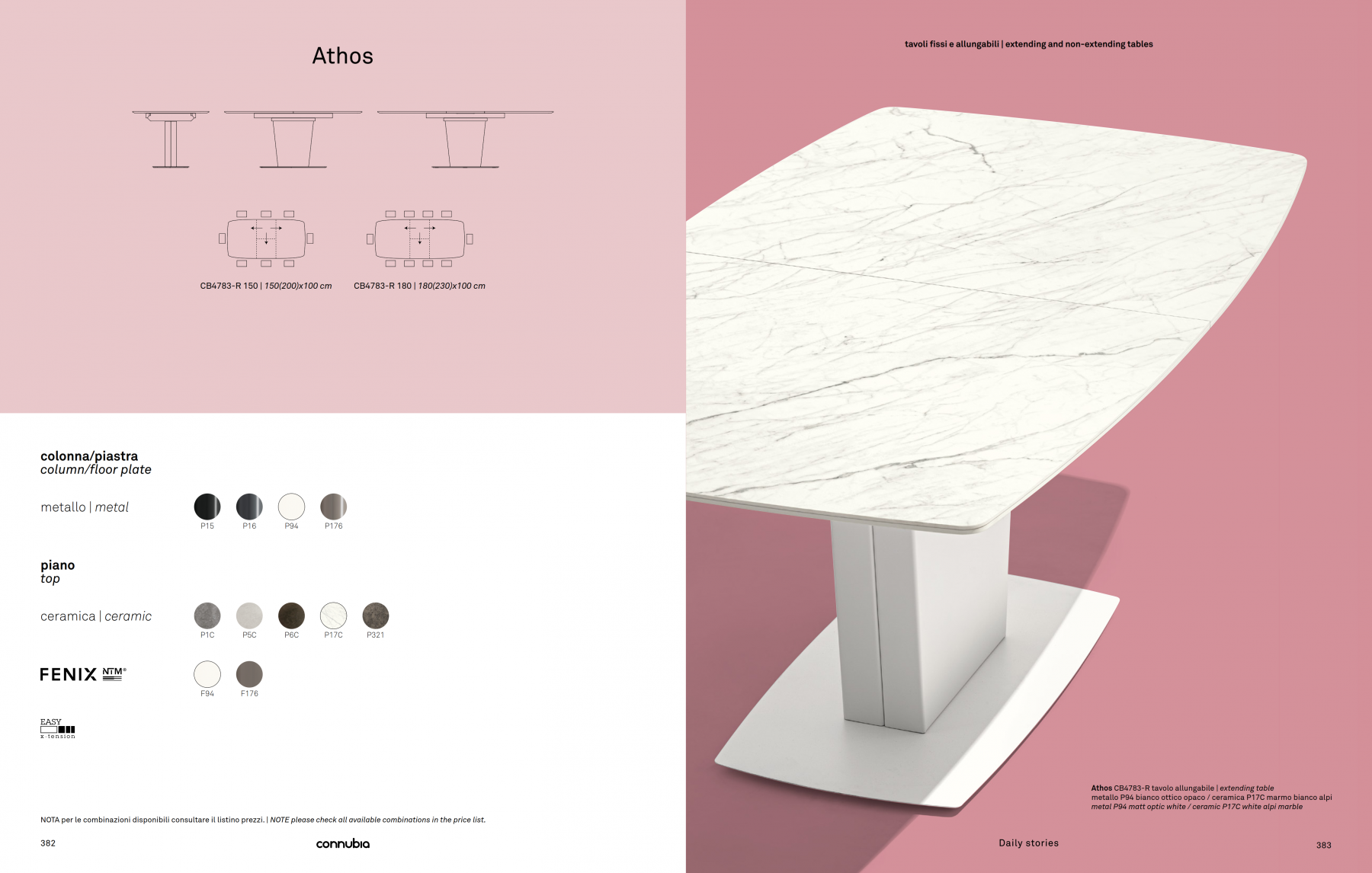 ATHOS is a table with a central butterfly leaf extension. The central column is made from metal and the top is either ceramic, tempered glass or FENIX NTM®. FENIX NTM® is an innovative material treated with new-generation acrylic resins that are pleasantly soft to the touch. The variety of different combinations of frame, legs and top allows you to create solutions with a strong look.