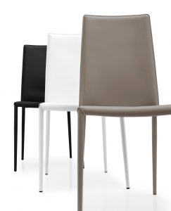 Model BOHEME Chair, with metal frame and matching seat/backrest, covered in regenerated leather. The seat and backrest are covered in regenerated leather – a material made from leather and other natural fibres and finished like thick leather – while the tapered legs are in steel tubing. The attention to design of the lines can be seen also in the chromatic consistency between the frame and the contoured seat. The exposed seams further enrich the chair.