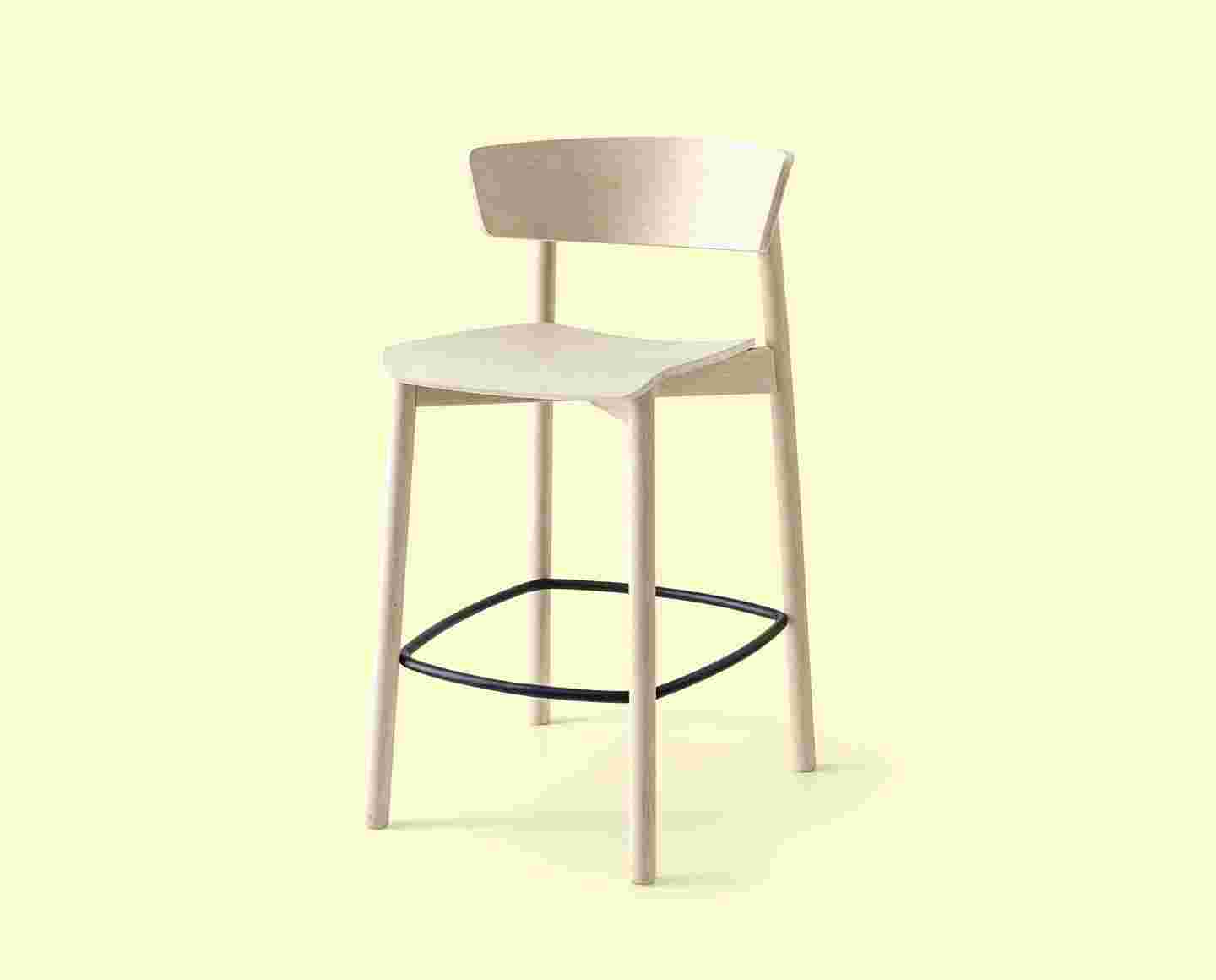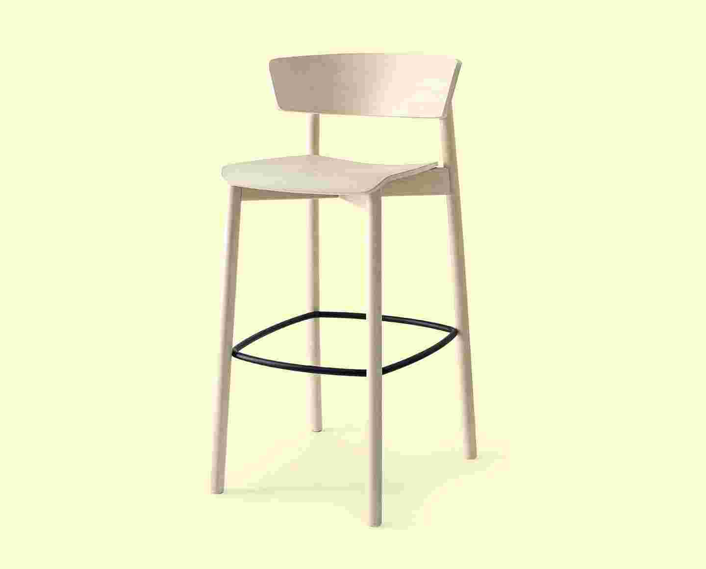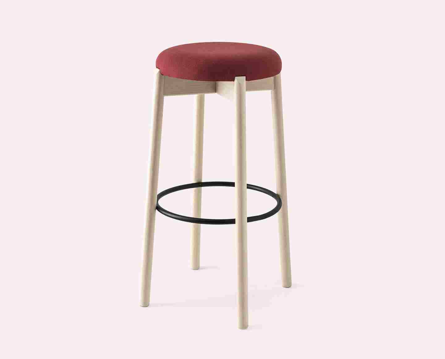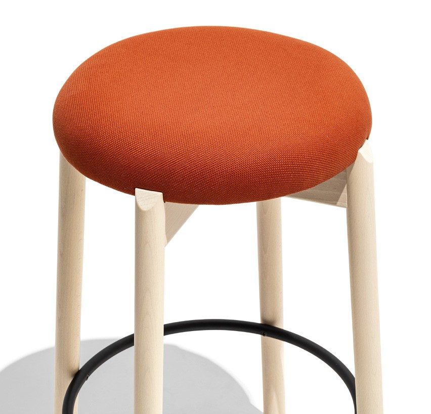 CLELIA stool with backrest. Wooden structure and padded or plywood seat. Cylindrical legs and backrest made to match the base. Metal footrest.
