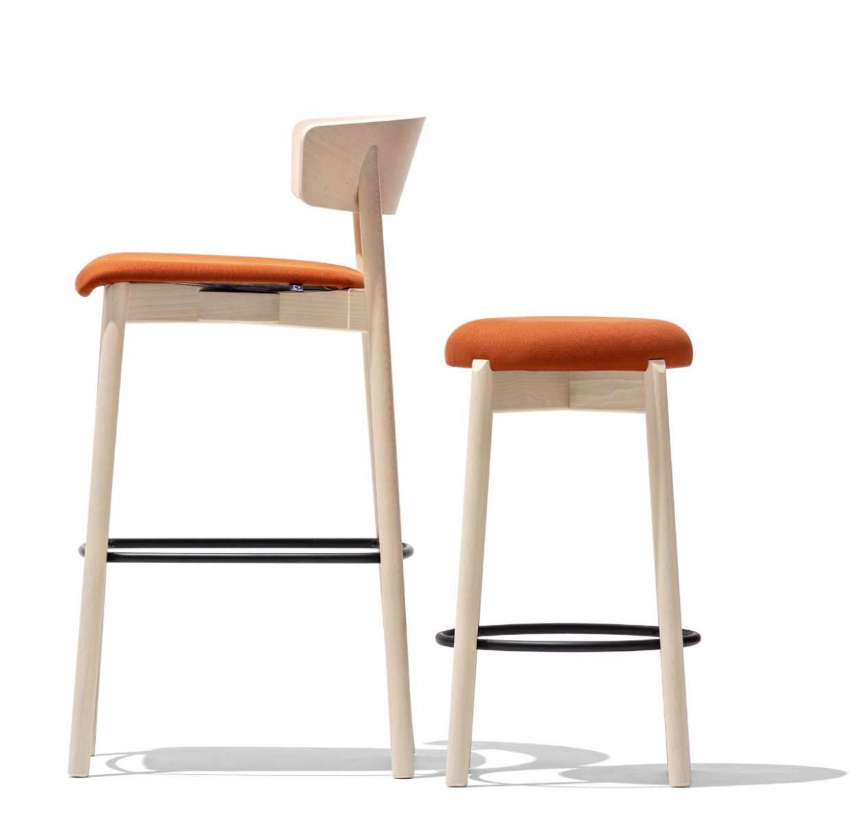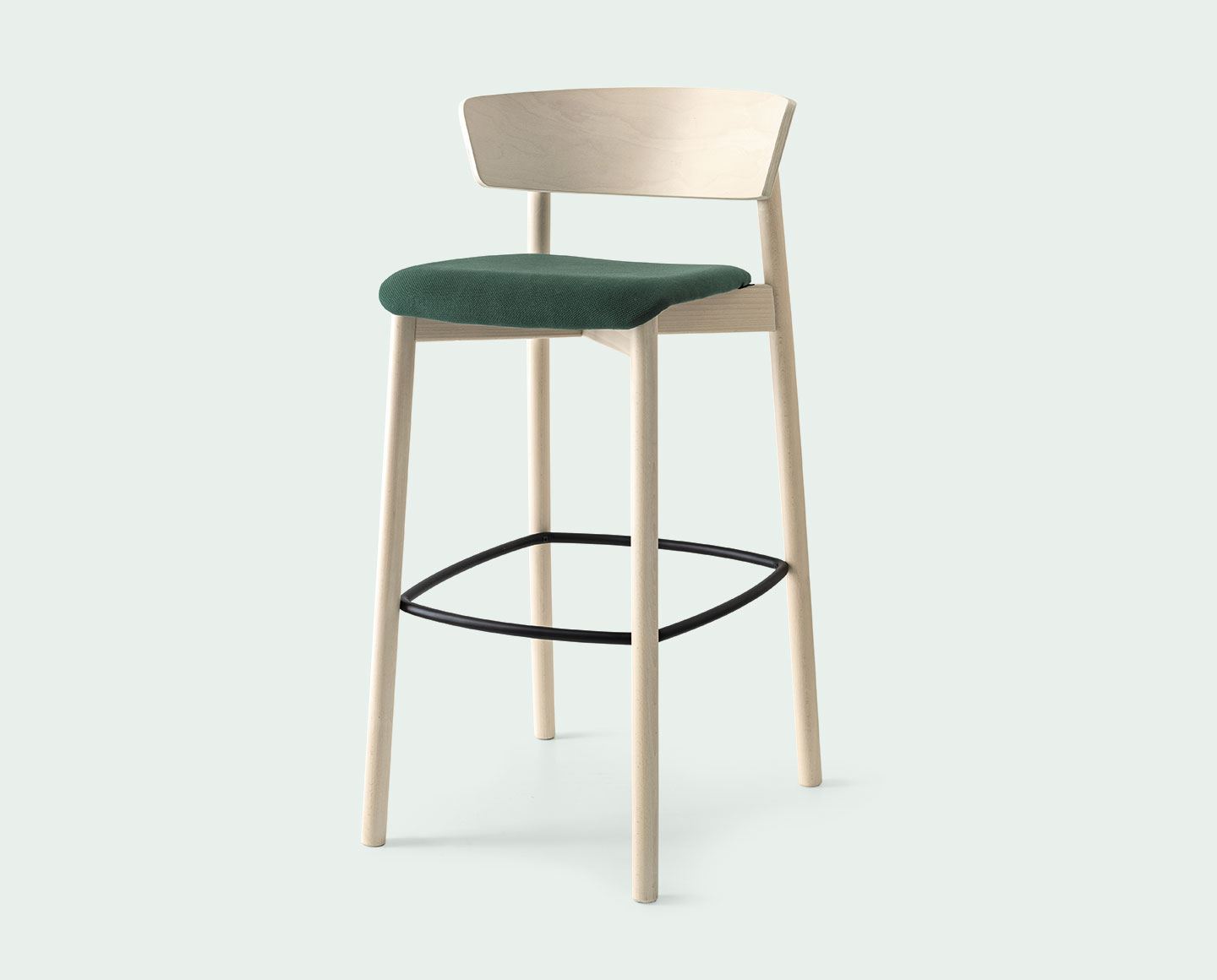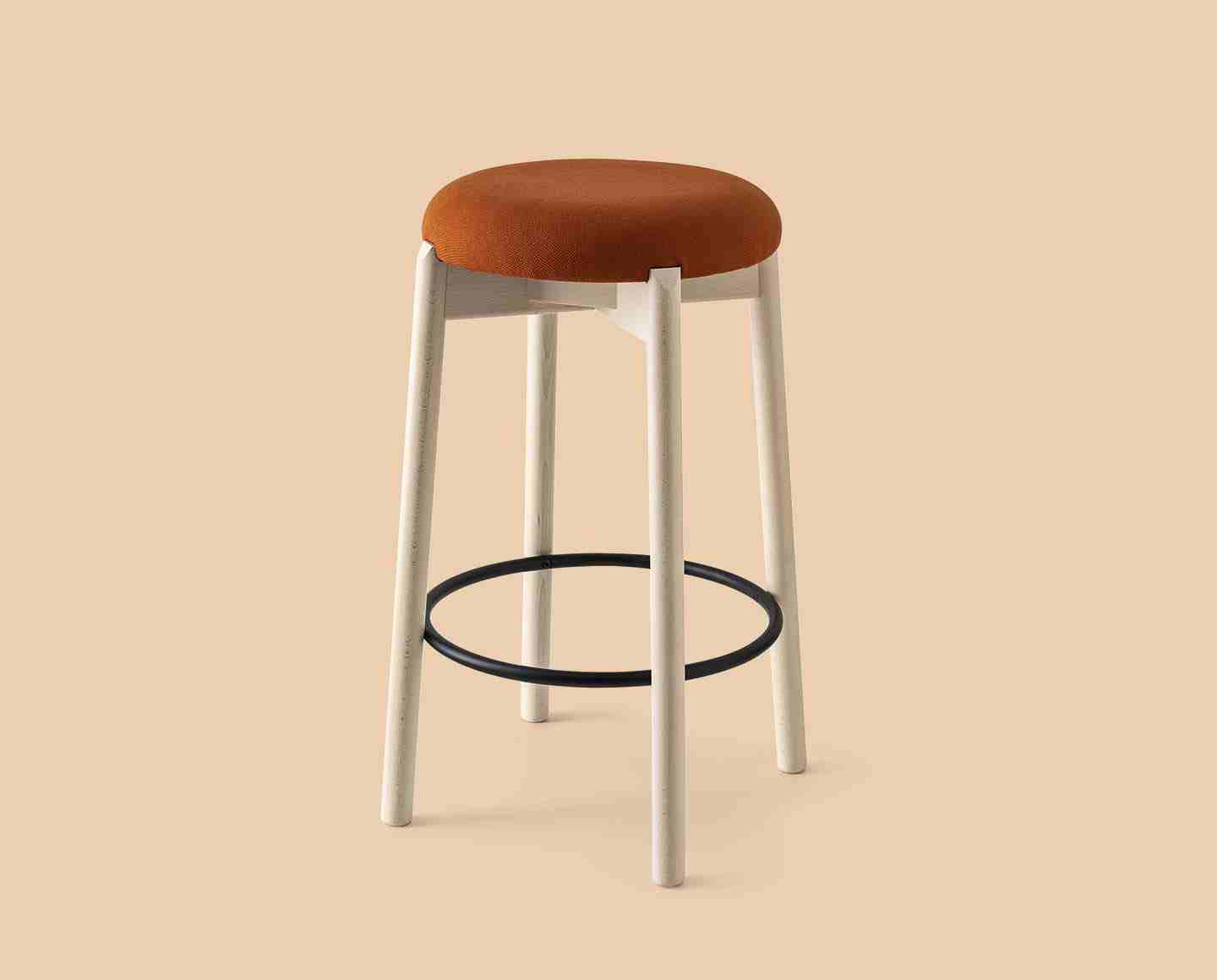 CLELIA stool with backrest. Wooden structure and padded or plywood seat. Cylindrical legs and backrest made to match the base. Metal footrest.