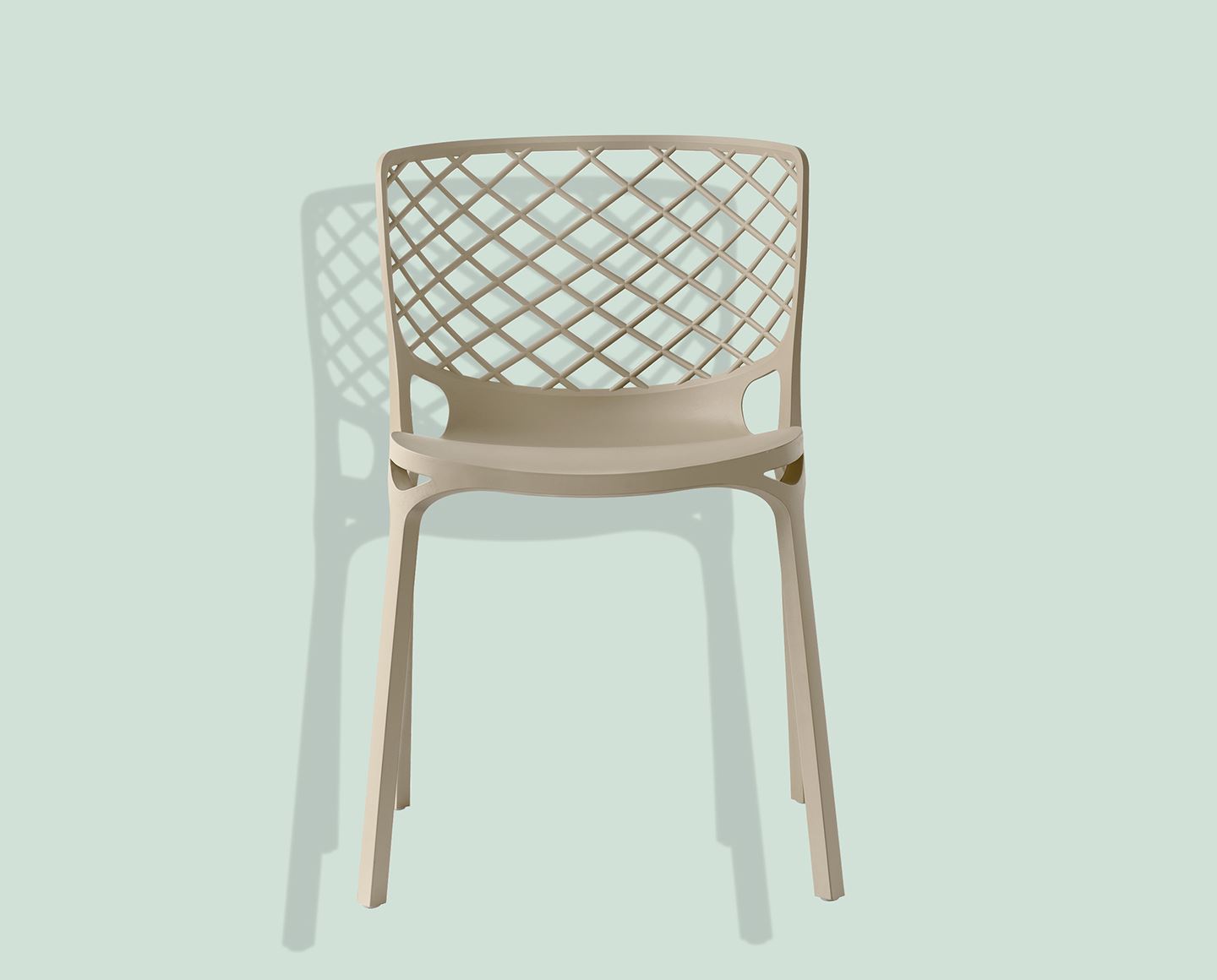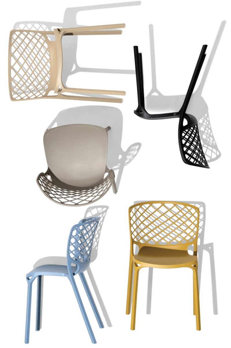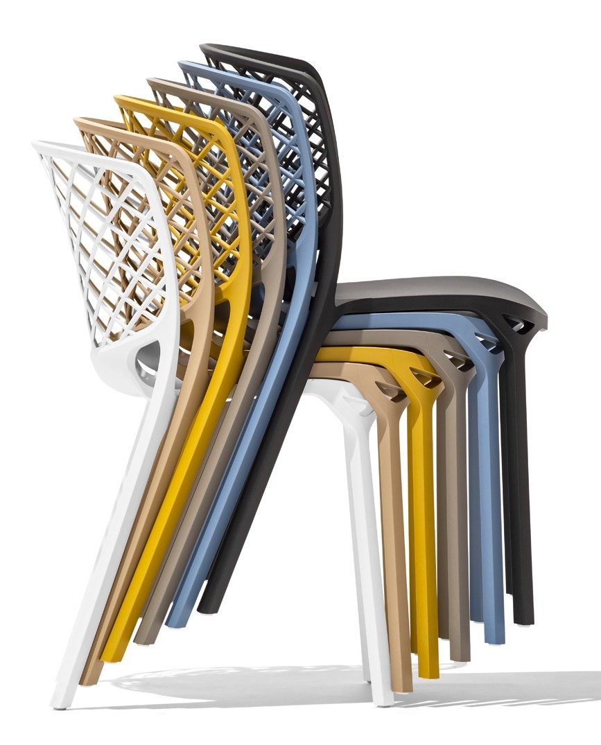 GAMERA model nylon chair suitable also for outdoor use. Reinforced nylon monoblock shell, stackable up to six chairs high. A design chair, whose unique shape, lightness and resistance are the result of its manufacturing technique, sinuous lines and the materials used. The wide wrap-around backrest guarantees a safe and ergonomic position.