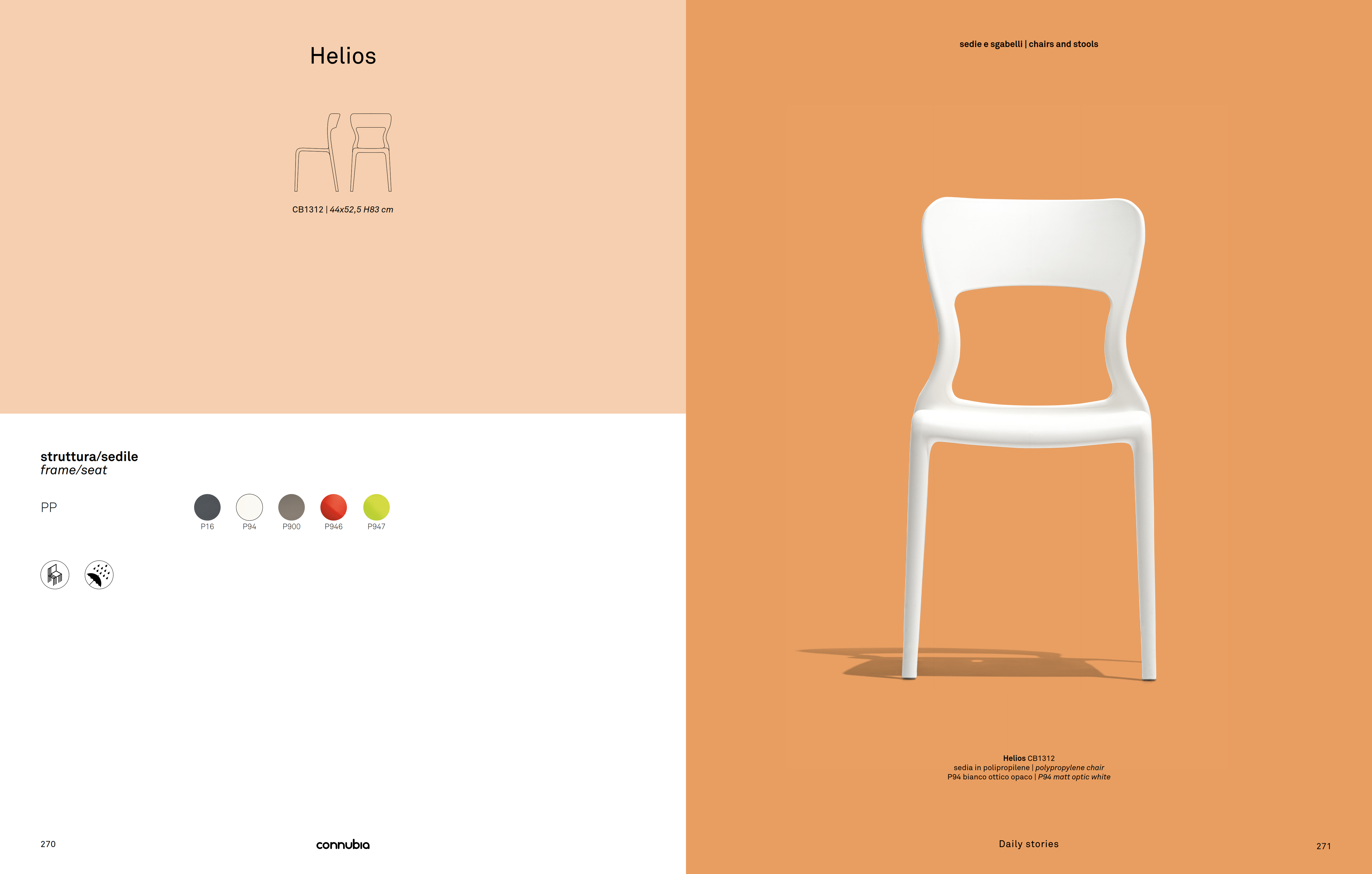 HELIOS chair with polypropylene frame. Polypropylene reinforced with invisible glass fibre and moulded for a product that is pleasant, functional and ergonomic. Stackable up to 10 chairs high. Sturdy and easy to clean, making it ideal for use in the home, meeting venues, both indoors and outdoors.