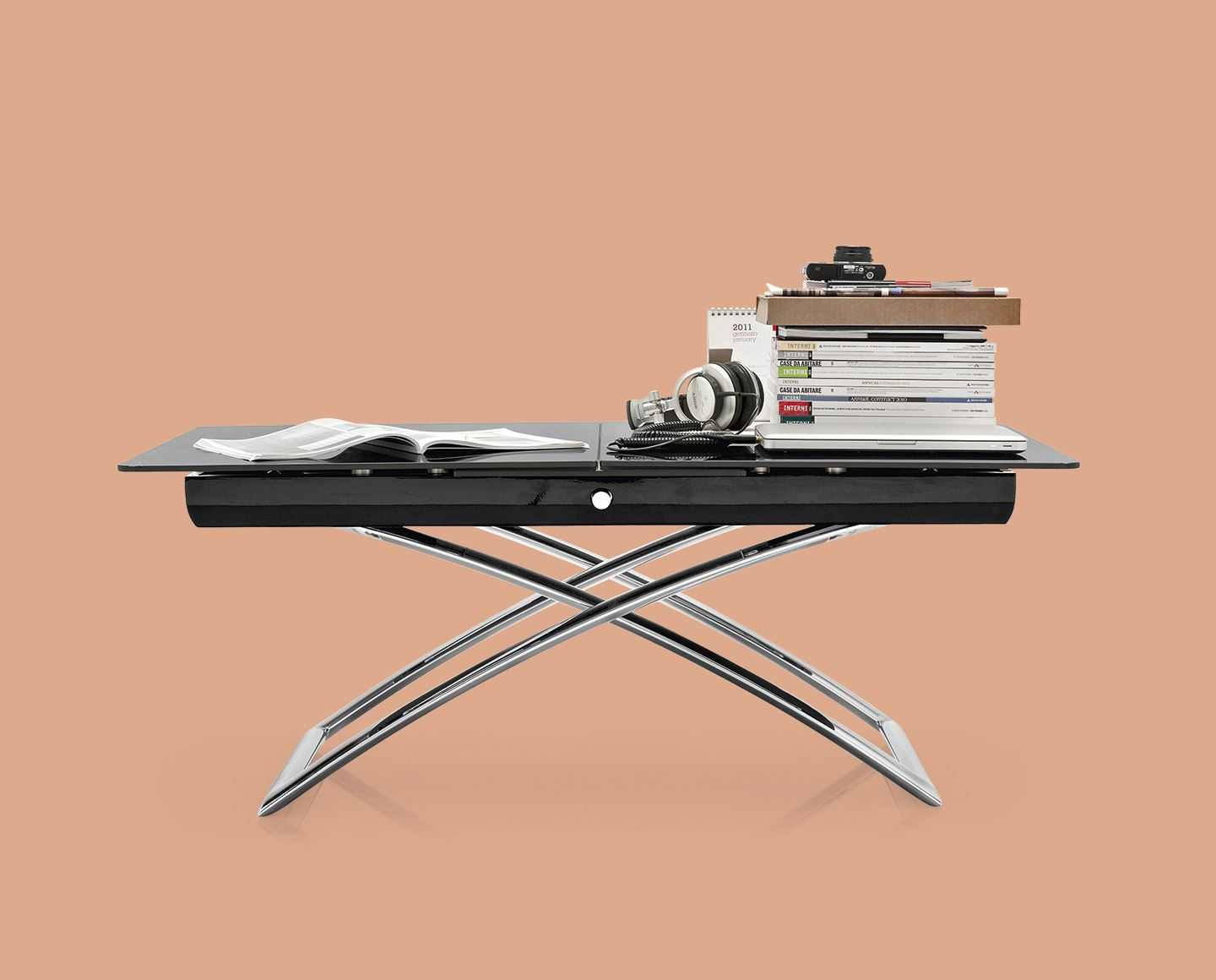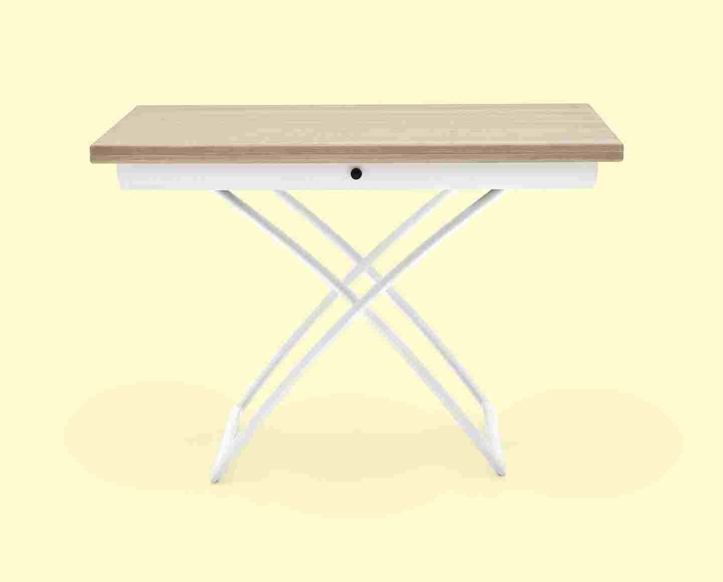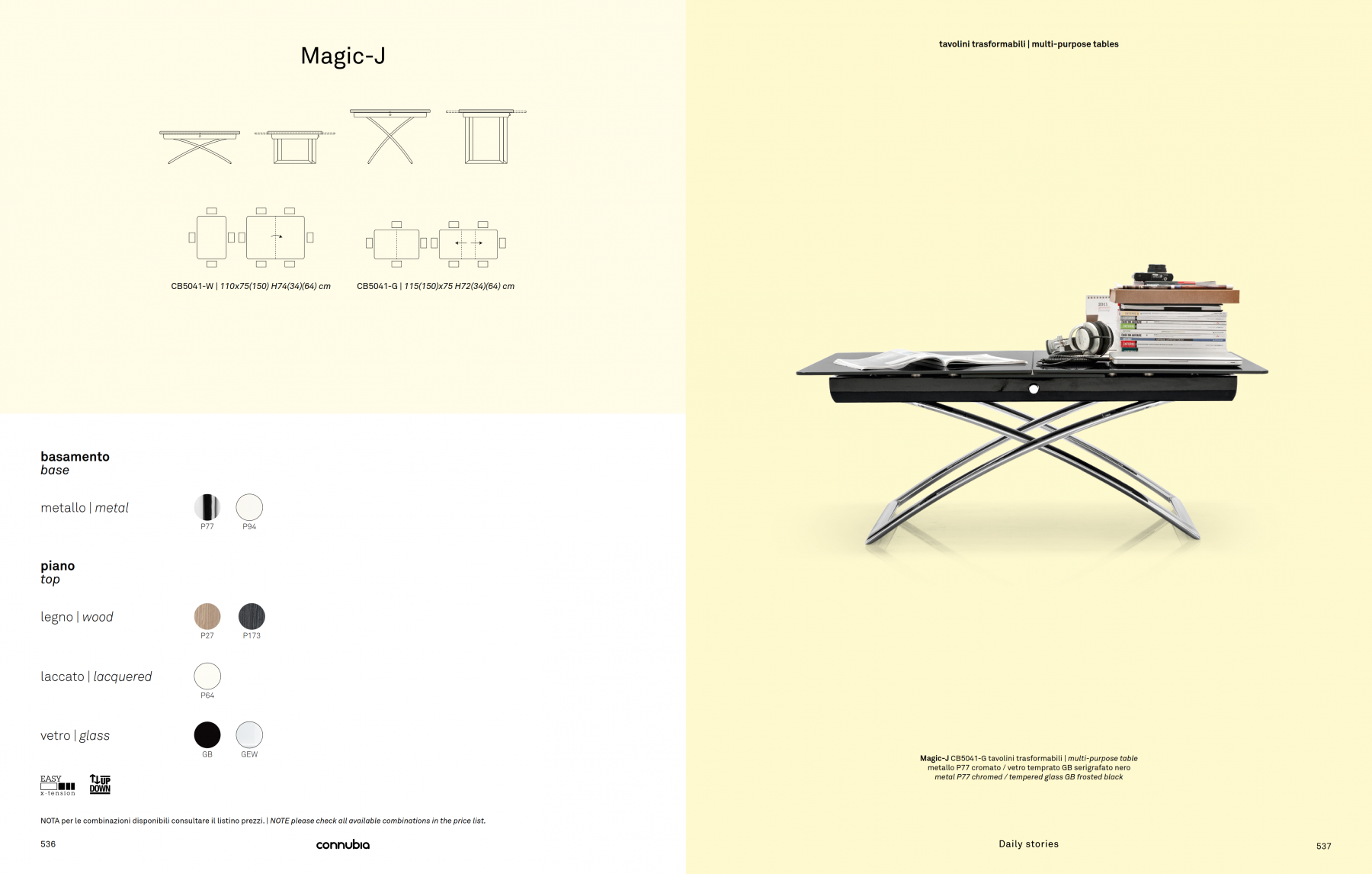 MAGIC-J model glass coffee table, metal frame, glass top. Extendable and height-adjustable. MAGIC-J glass is a versatile coffee table for your living area which, if necessary, and with just a few movements, turns into a dining table for 4-6 guests.