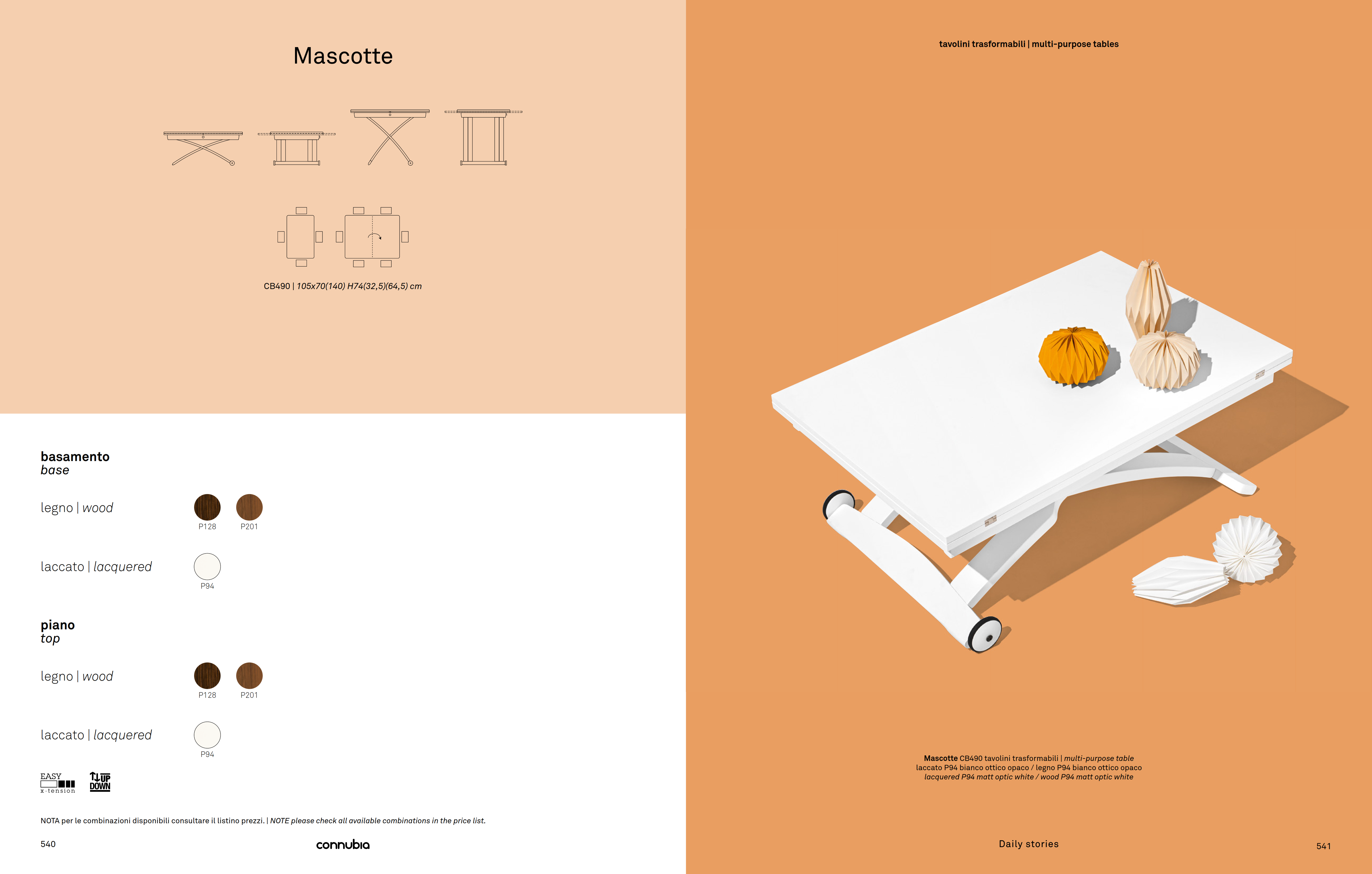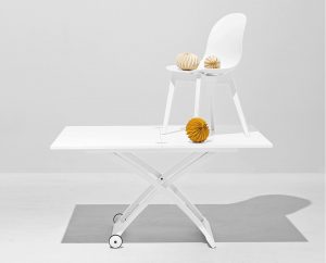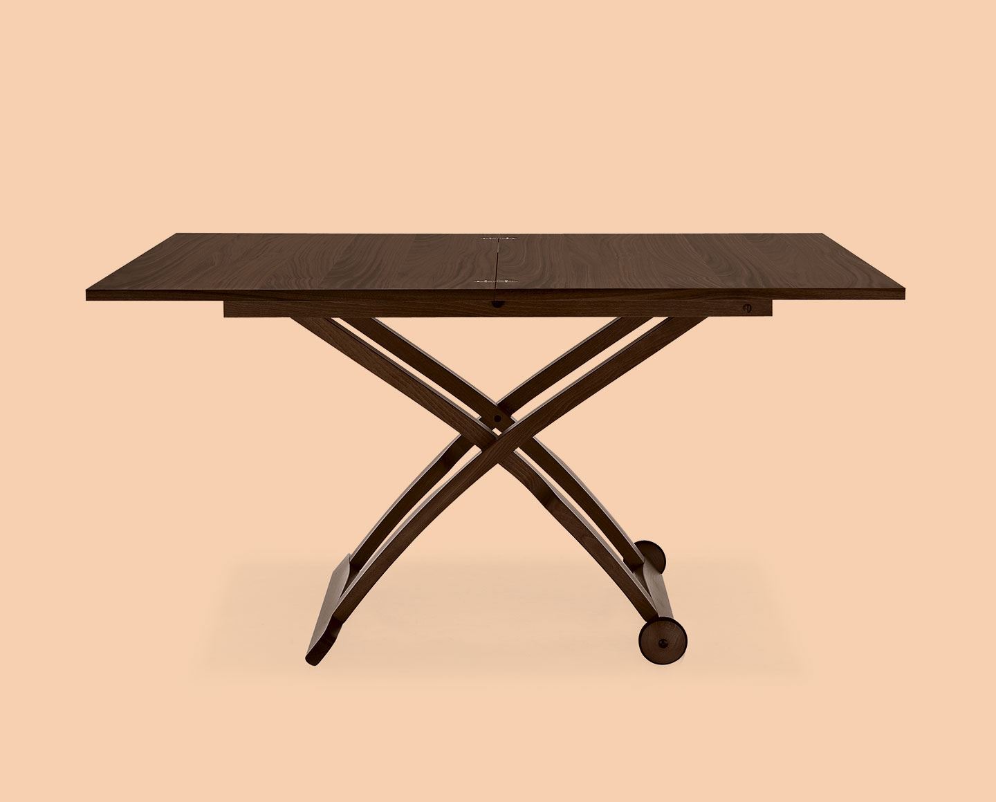 MASCOTTE is a versatile coffee table for your living area which, if necessary, and with just a few movements, turns into a dining table for 6 guests: just press a button, placed on the long side, to adjust the height to 7 different positions. The wooden top can double its length thanks to the practical butterfly opening mechanism.