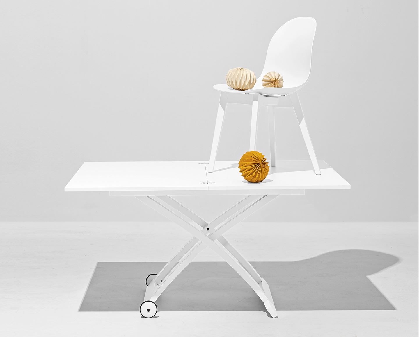Easy to move thanks to two soft scratch-resistant rubber wheels, the MASCOTTE coffee table loves simply to be there and to transform within the home environment according to your needs.
