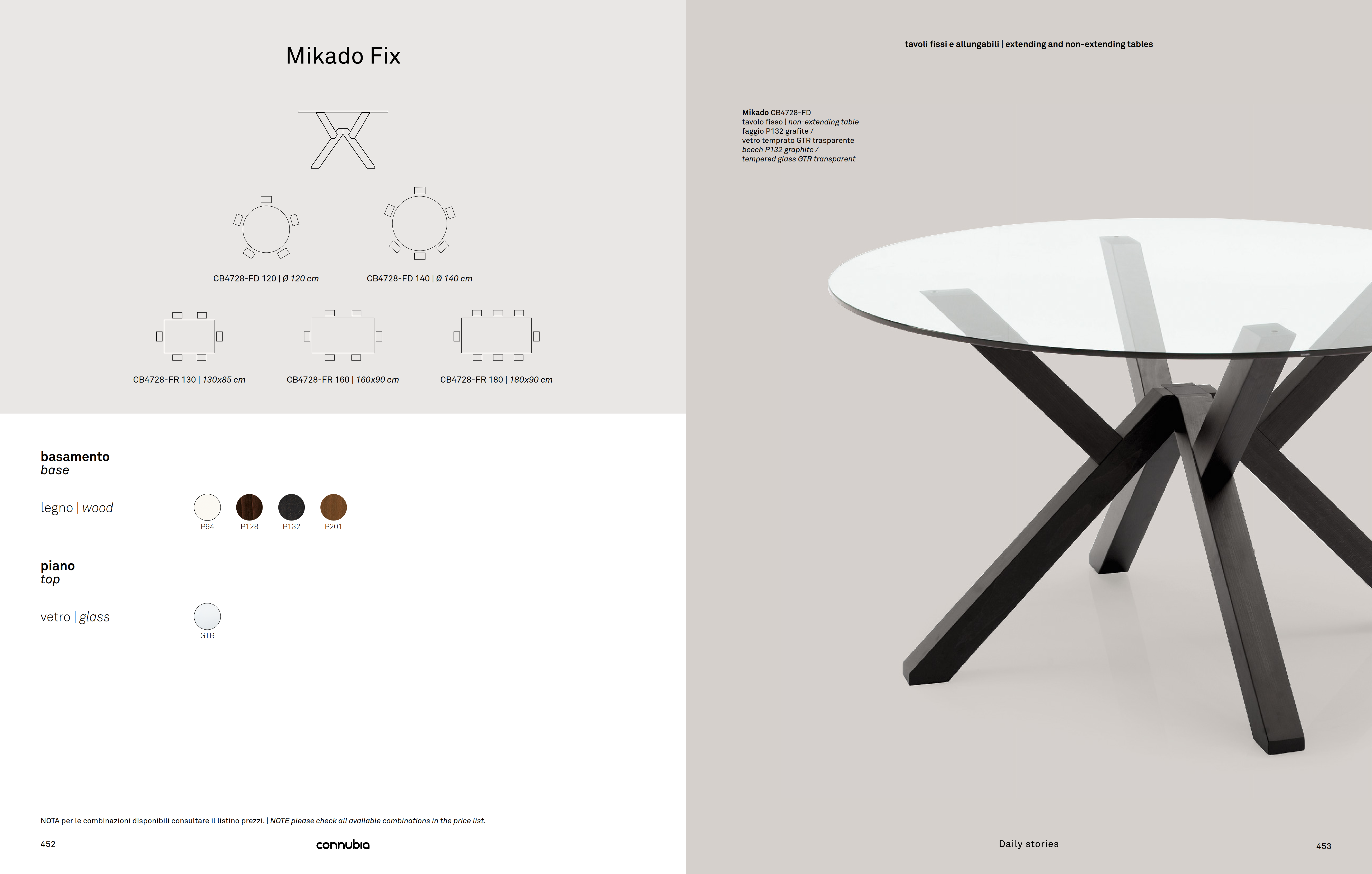 MIKADO is a fixed round table with a tempered glass top and a beech wood frame and legs. The main feature of this table is the design of the pedestal base, with trestles that are joint by a black varnished metal element. Also available in extendable table with a melamine top and a beech wood frame and legs.