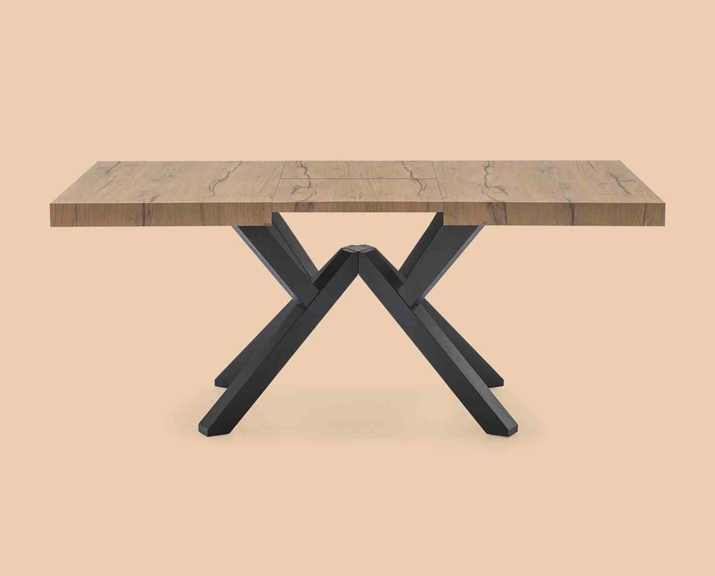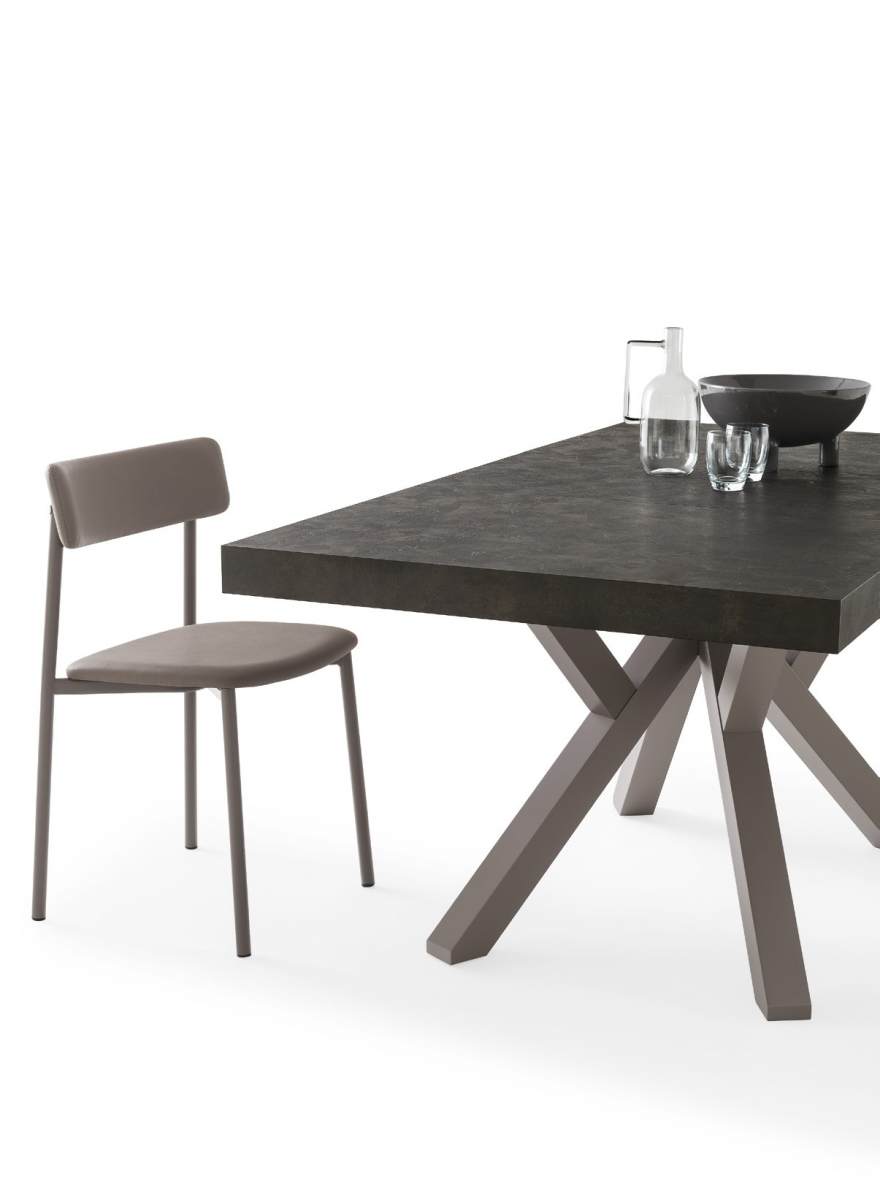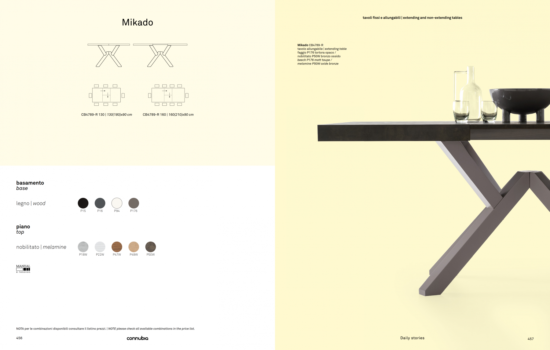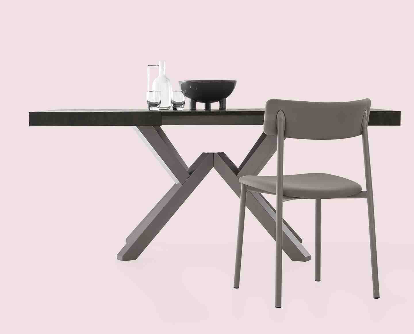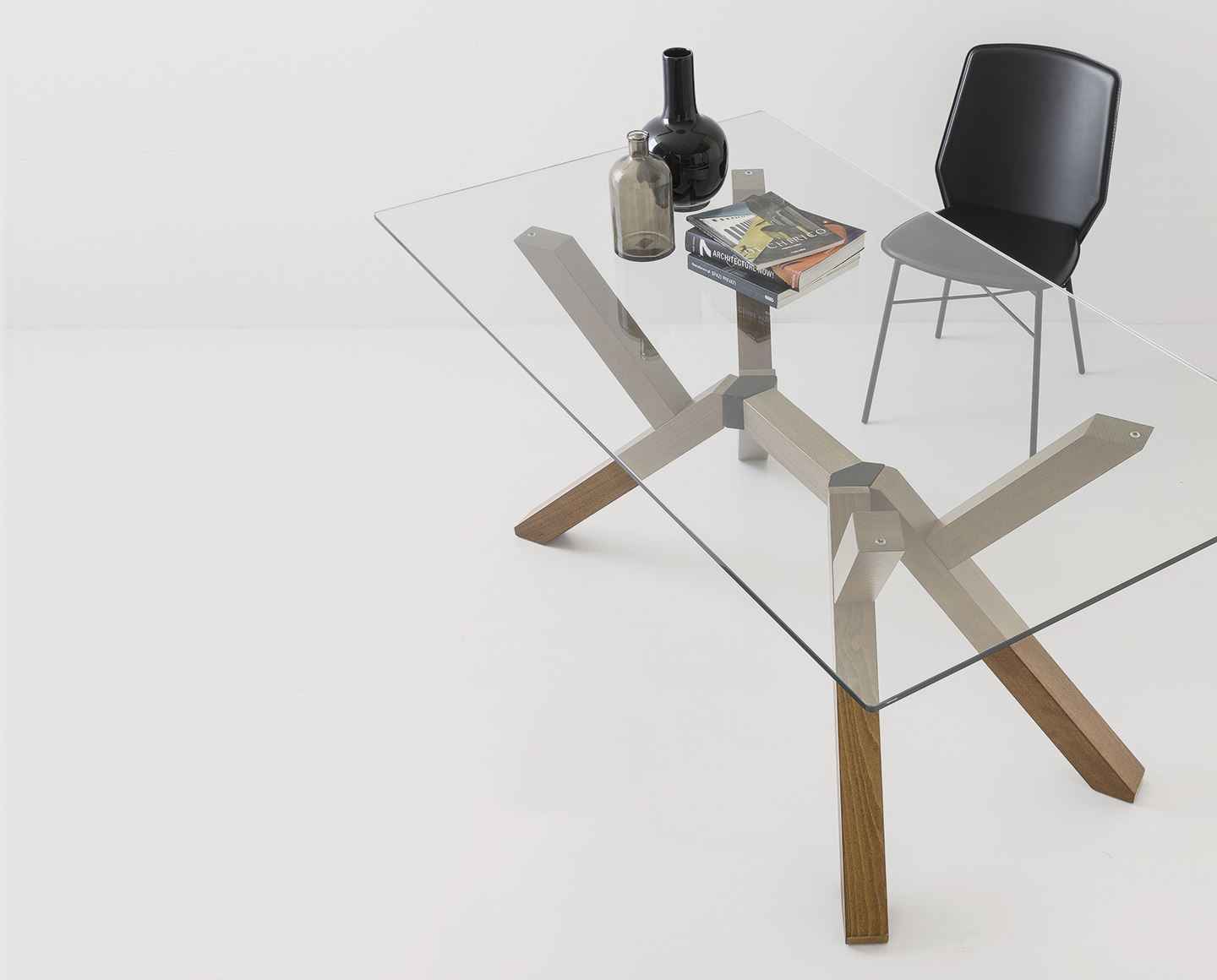 MIKADO is a fixed rectangular table with a tempered glass top and a beech wood frame and legs. The main feature of this table is the design of the pedestal base, with trestles that are joint by a black varnished metal element. Also available in extendable table with a melamine top and a beech wood frame and legs.