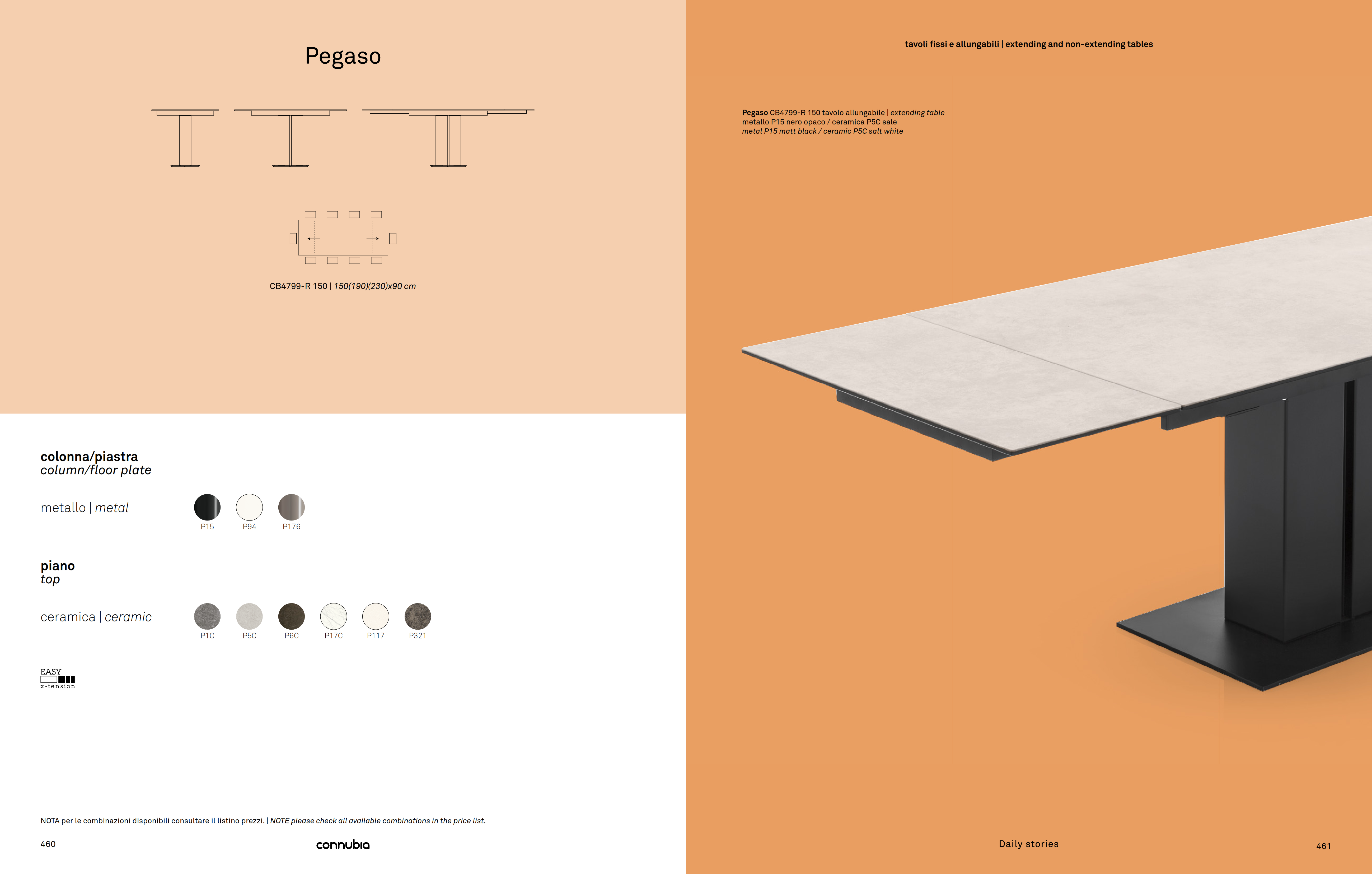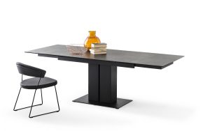 Extendable table with a weighted central metal base. The table is available with ceramic tops and it can be extended by means of two independent side extensions sliding on aluminium guides.