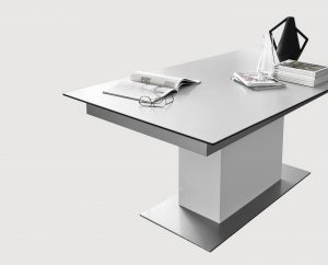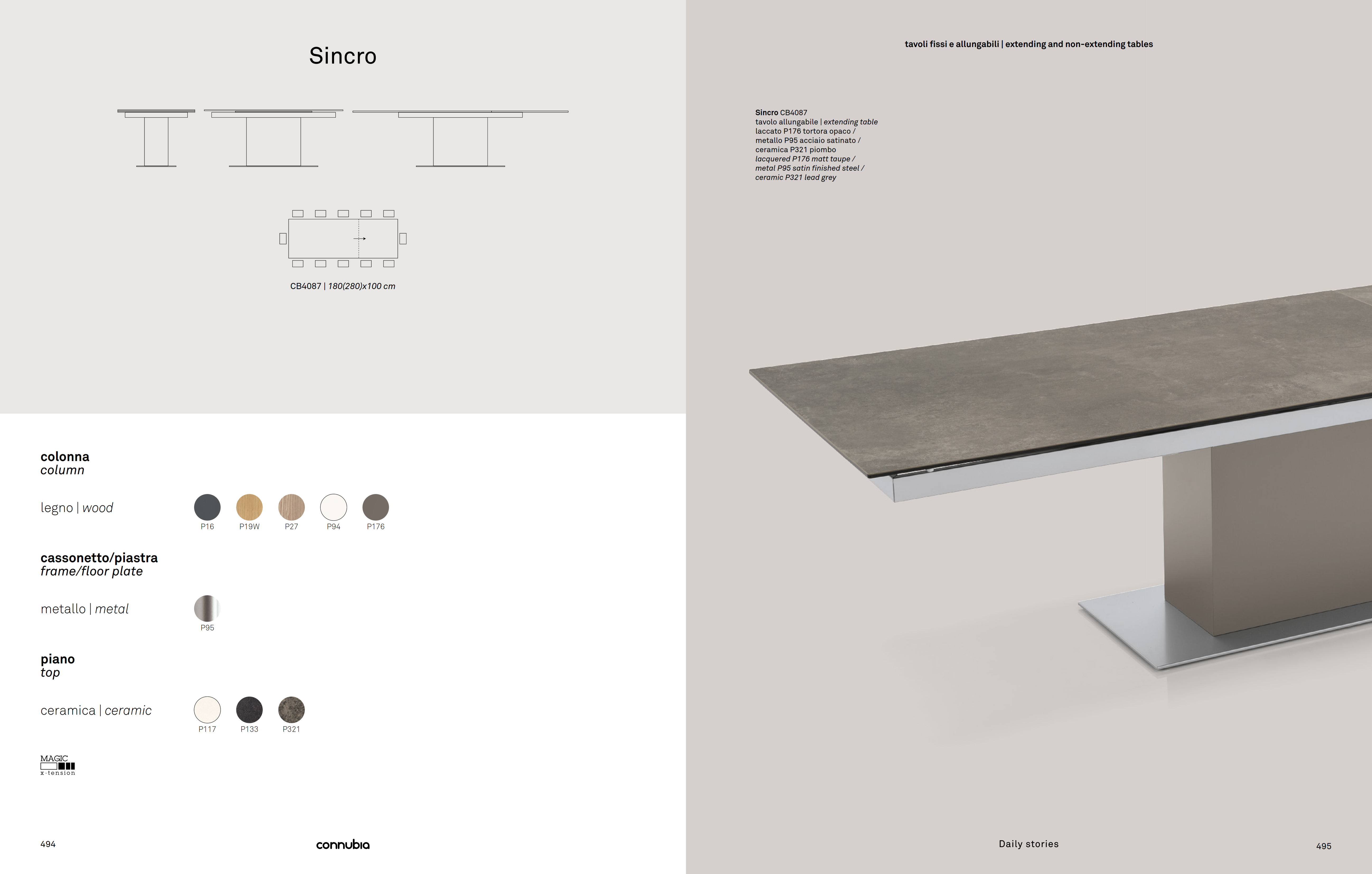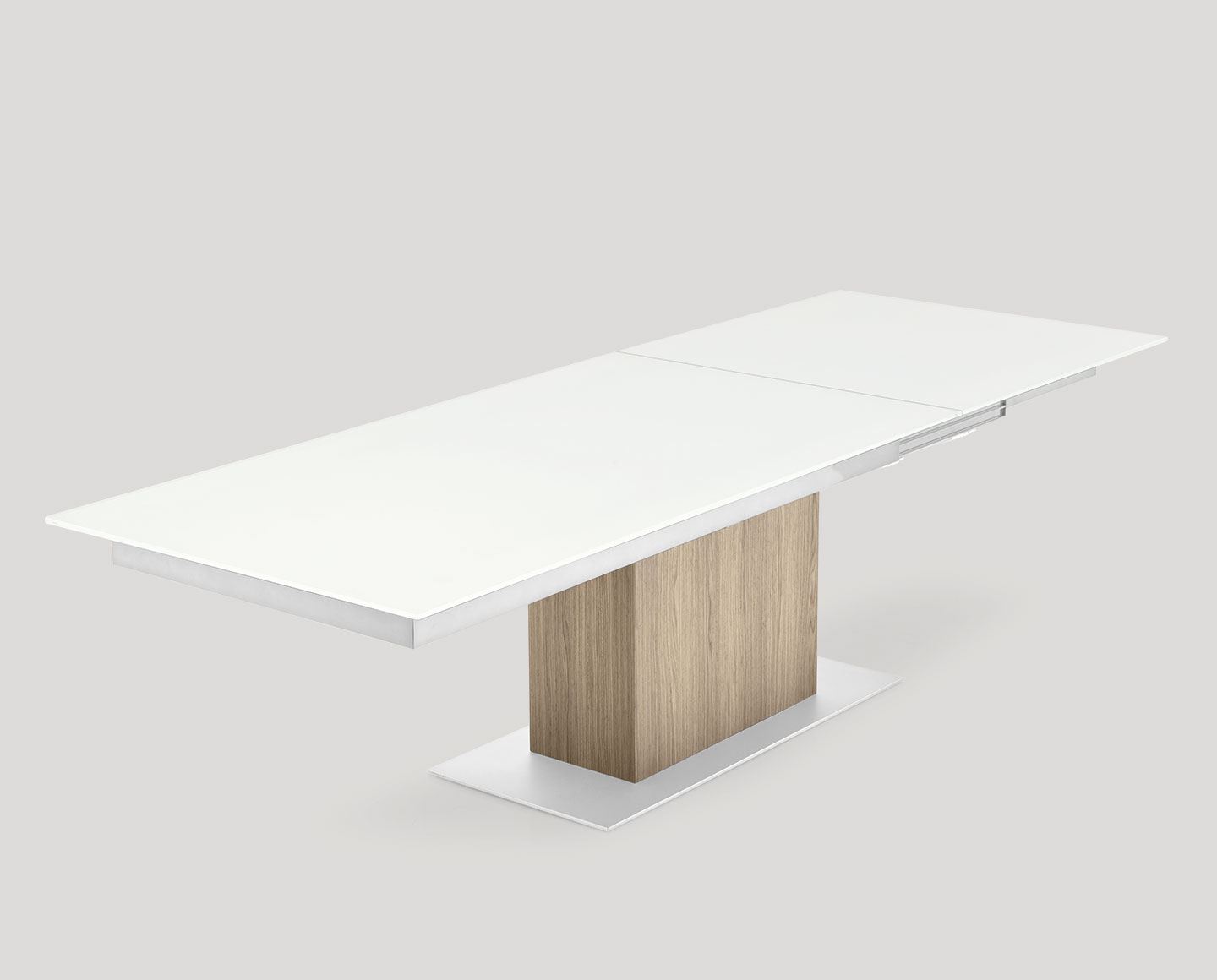 SINCRO is an extending table with a modern and essential design, characterised by a wide rectangular top in toughened glass or in a glass-ceramic combination, that rests on a solid wooden pedestal base with metal plate. SINCRO is a versatile, visually striking extra-long extending table. Ideal for decorating a spacious dining area and comfortably accommodating up to 12 guests.