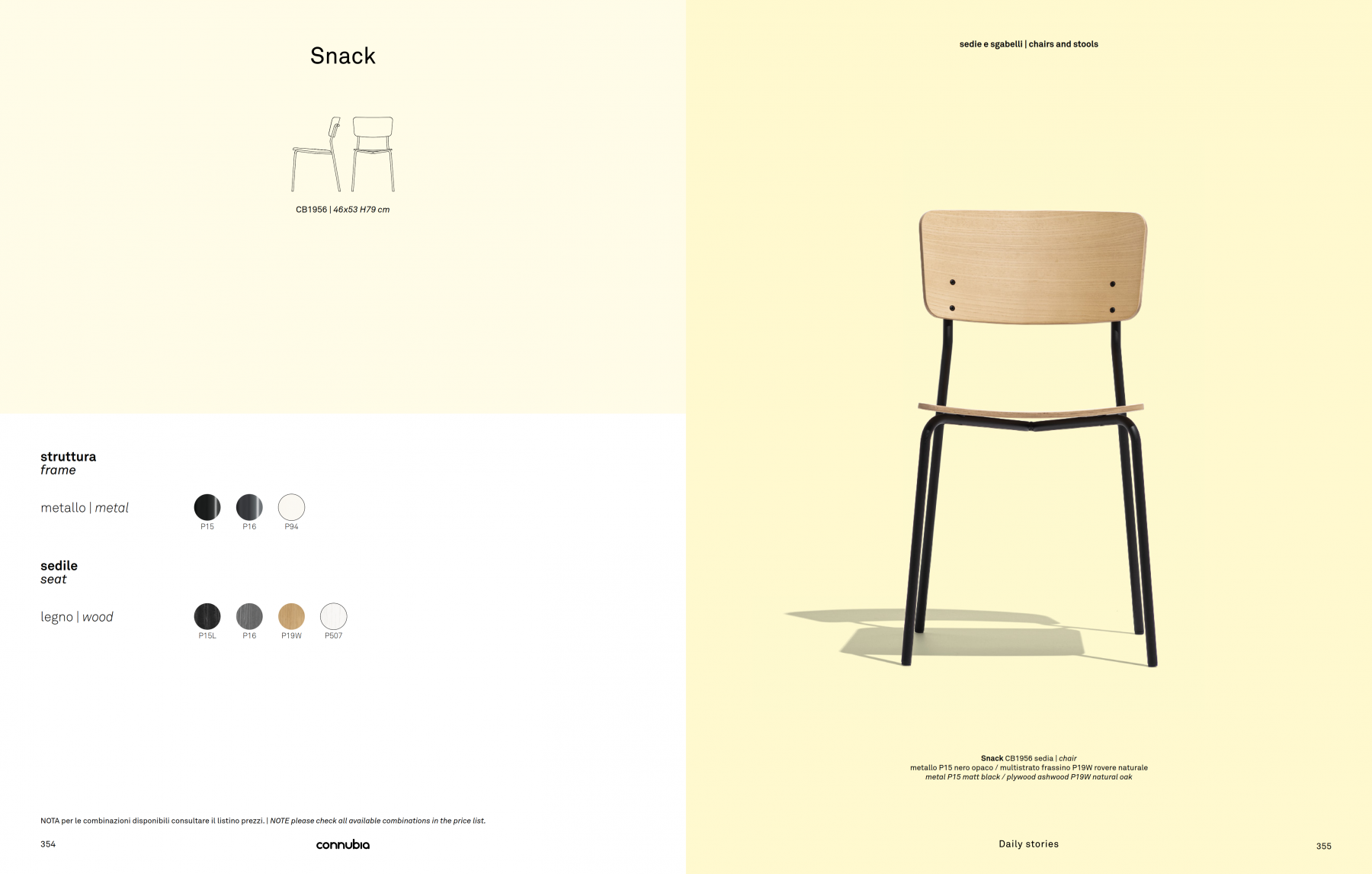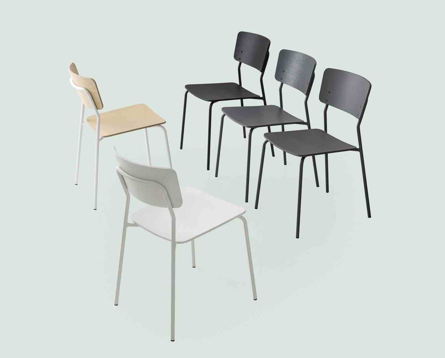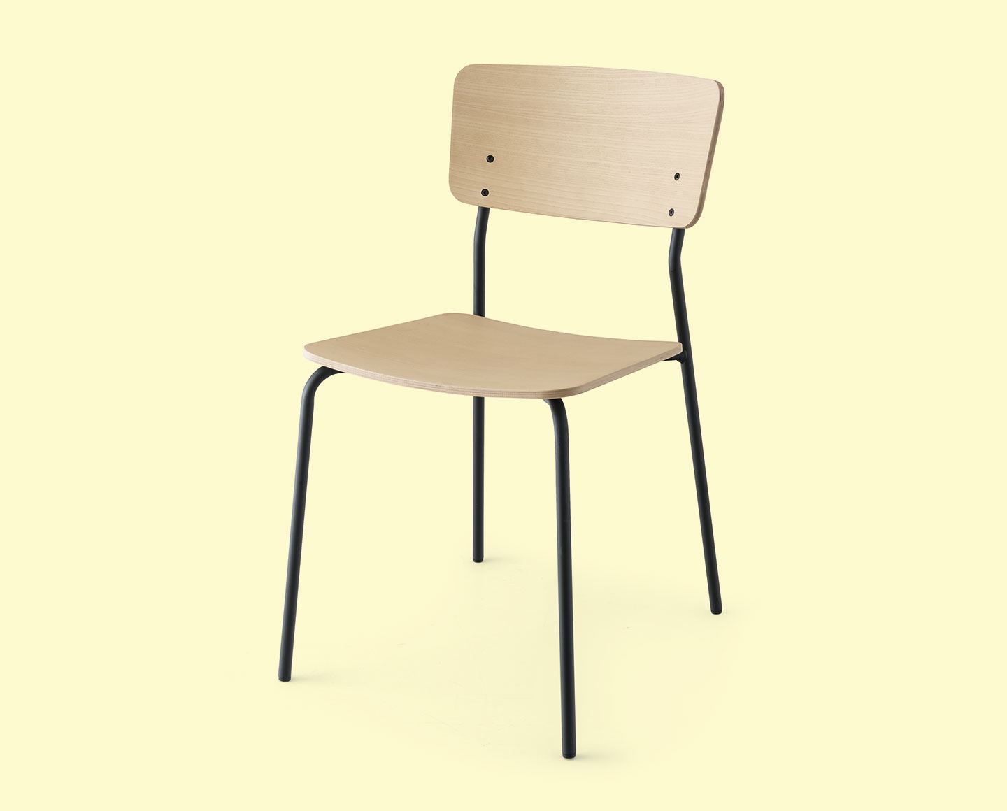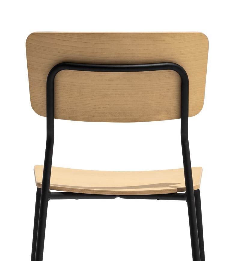 SNACK CHAIR with a metal frame and stained ash plywood seat and backrest or treated with open-pore lacquer for the seat. Decorative fastening screws visible on the front part. The chair needs assembly.