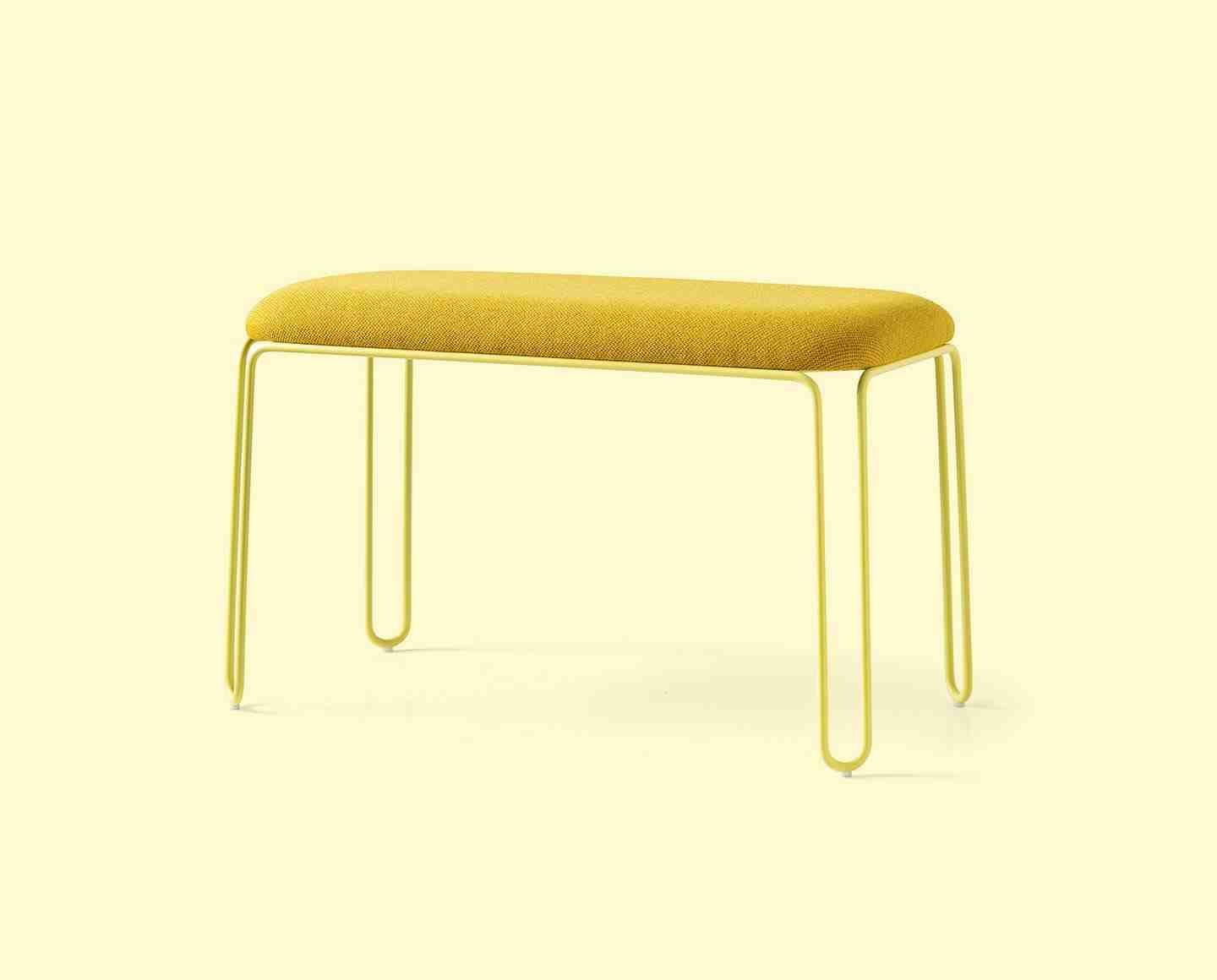 STULLE bench with a curved-metal-rod structure and rubber-coated wooden seat with fixed upholstery.