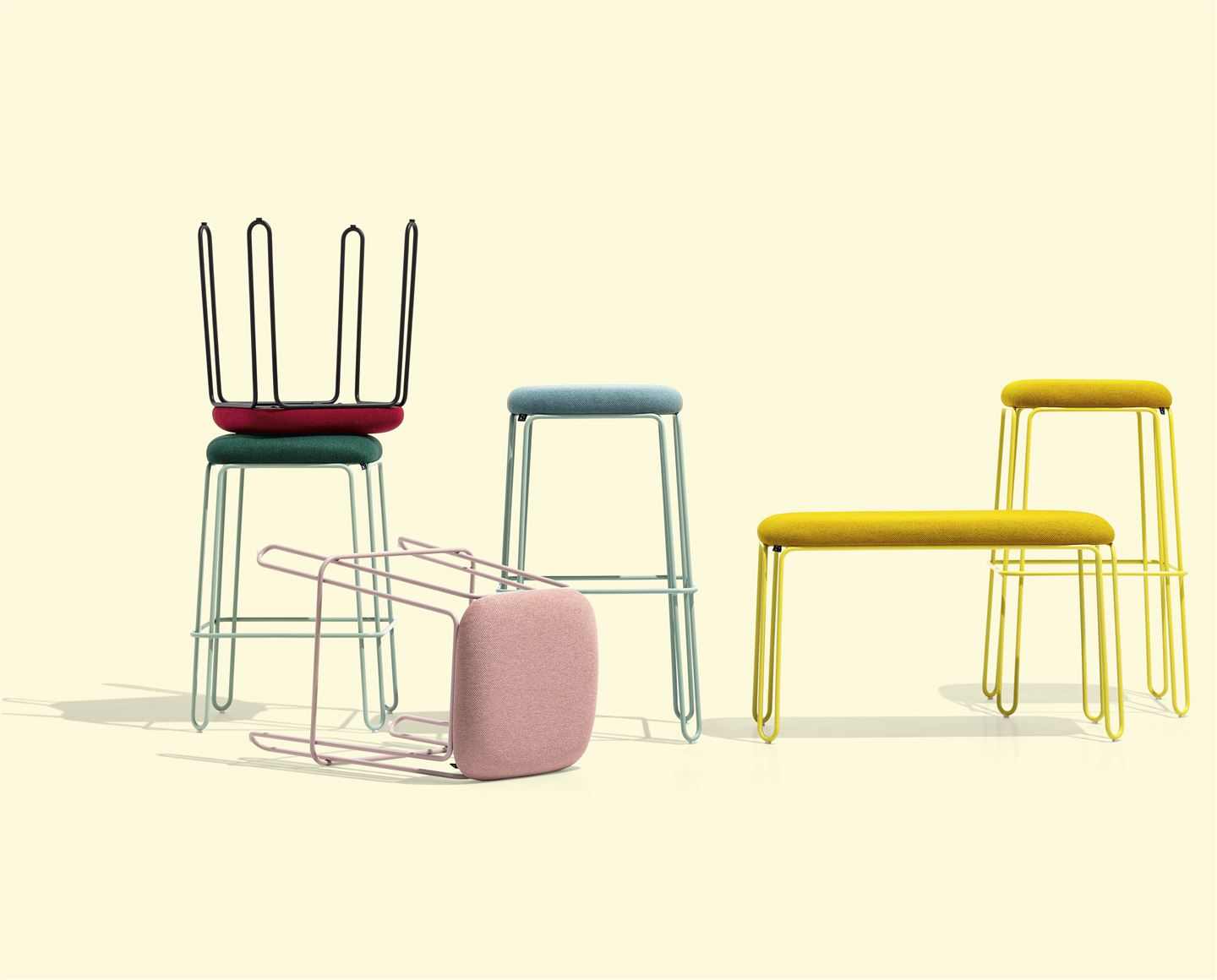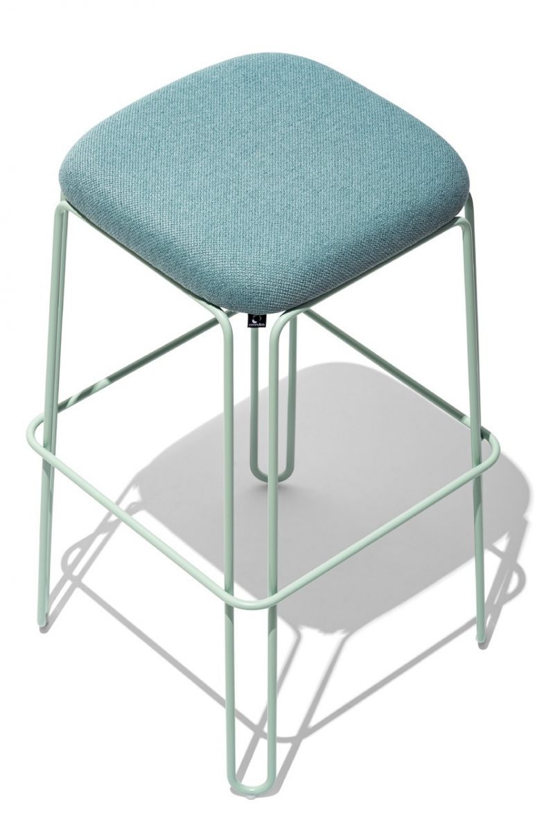 STULLE stool with a curved-metal-rod structure and rubber-coated wooden seat with fixed upholstery.