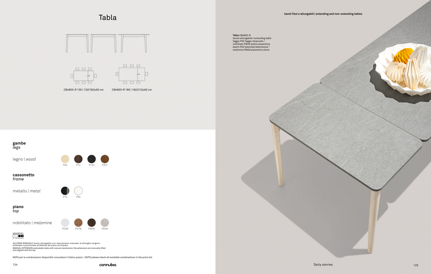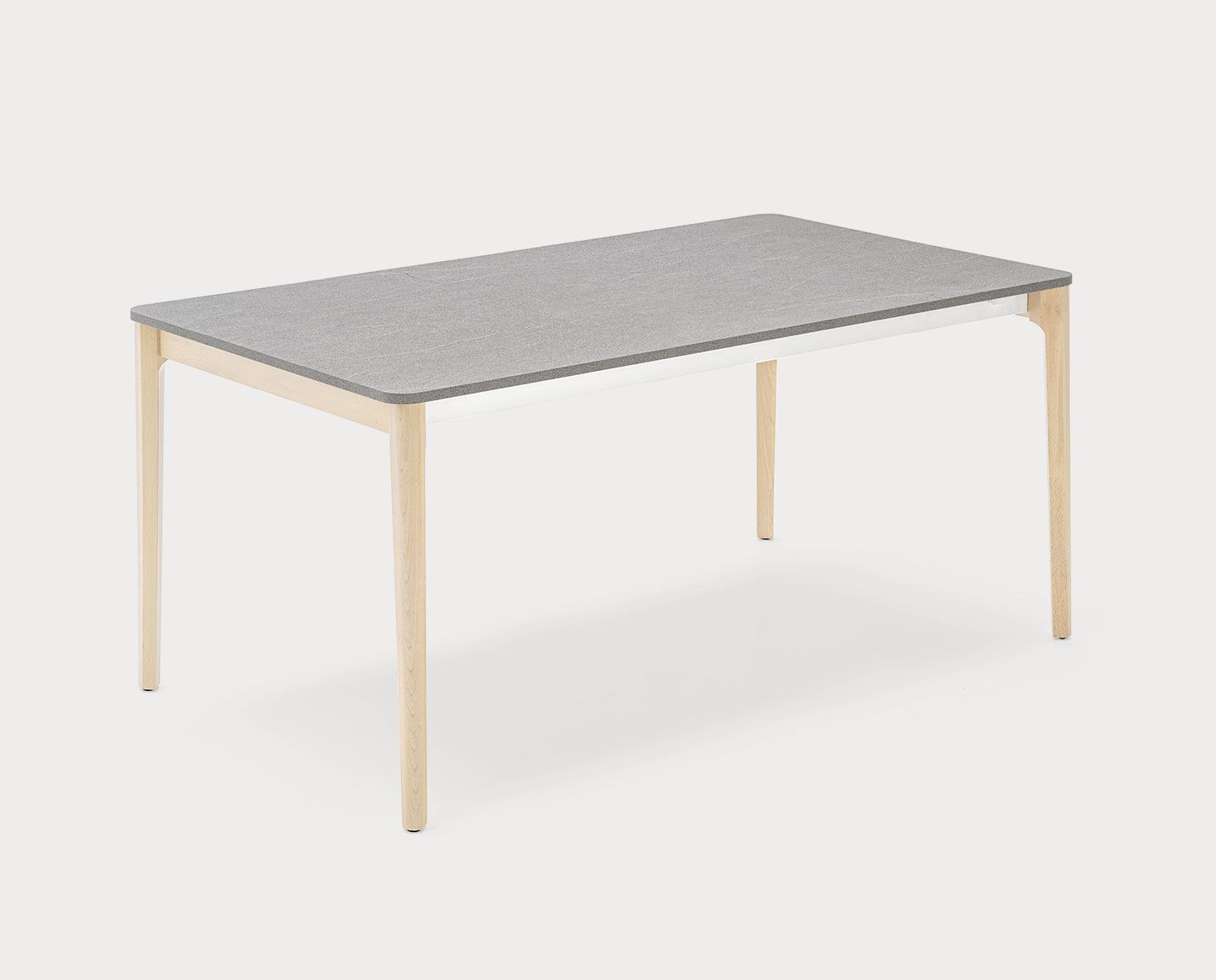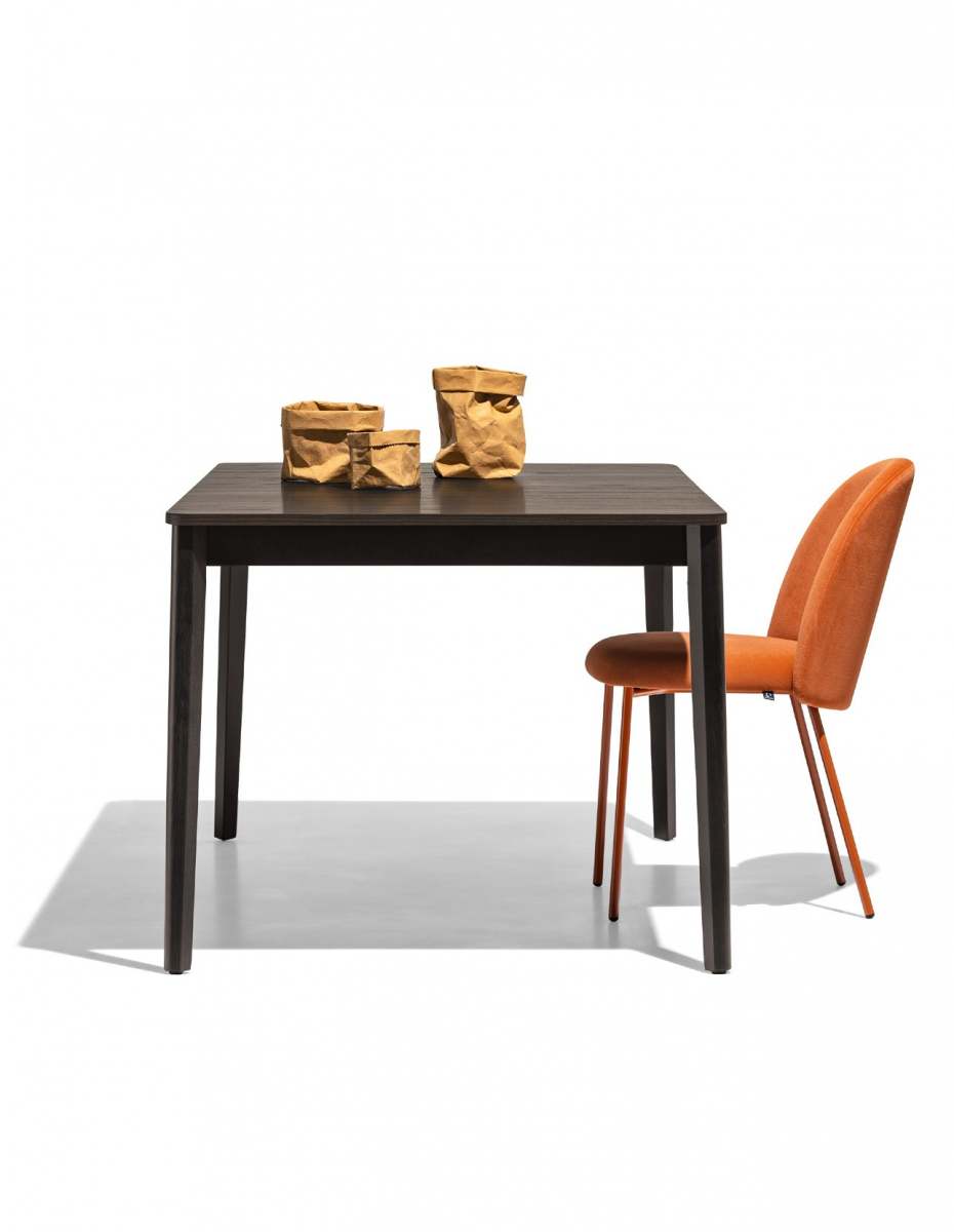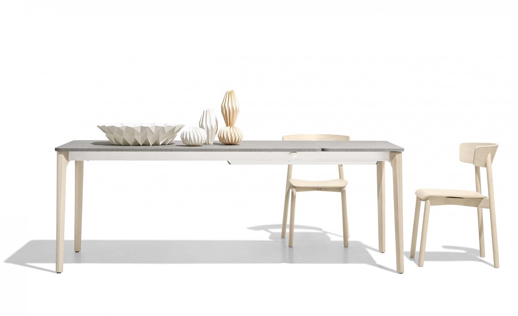 TABLA extendable rectangular table with a solid beechwood frame and tops with straight edges and rounded corners in melamine wood. The extension with rounded corners comes in a matching colour and is stored beneath the top.
