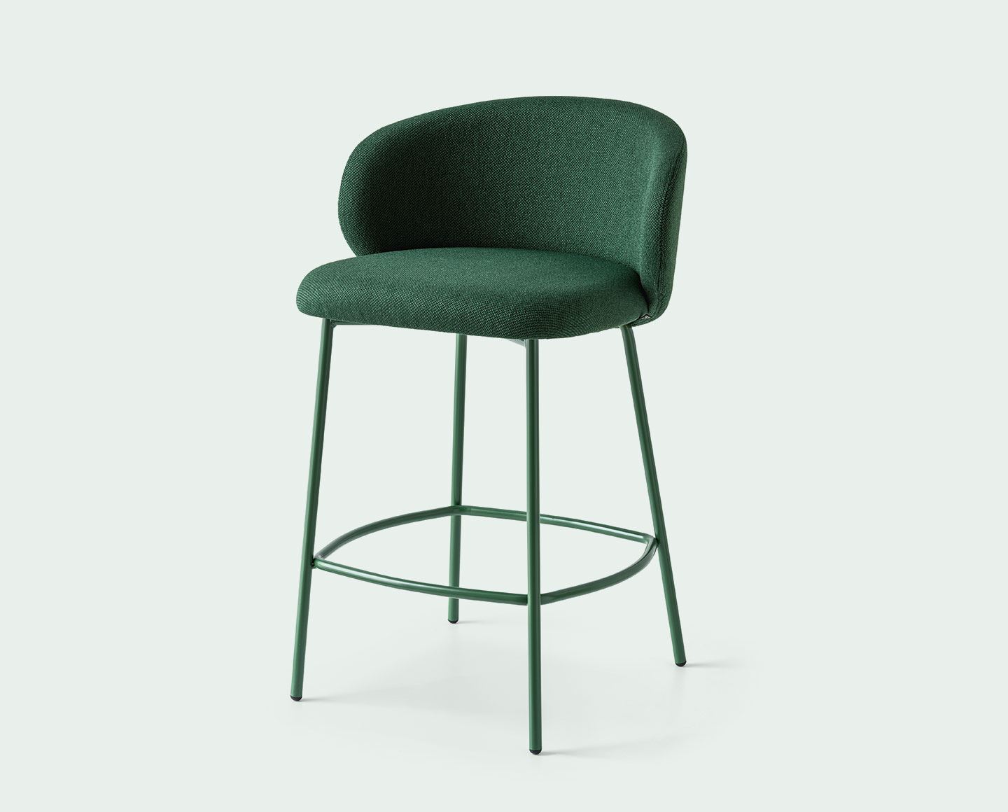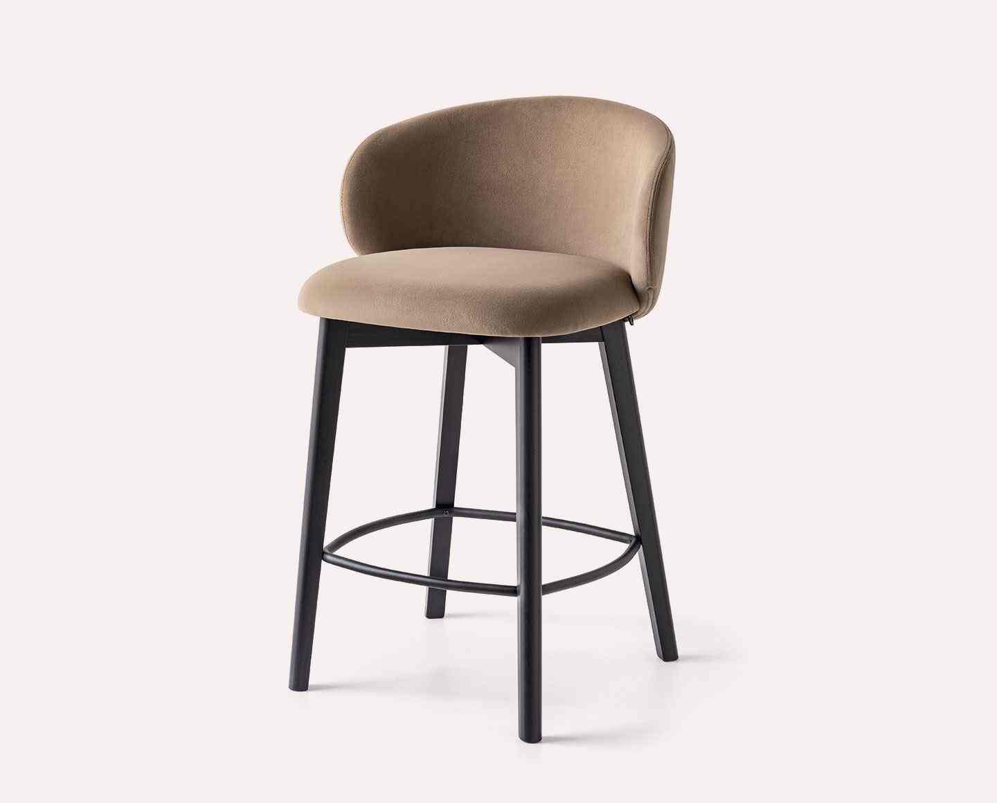 TUKA stool with metal base. Padded seat shell with fixed upholstery, wraparound backrest and rounded chair seat.