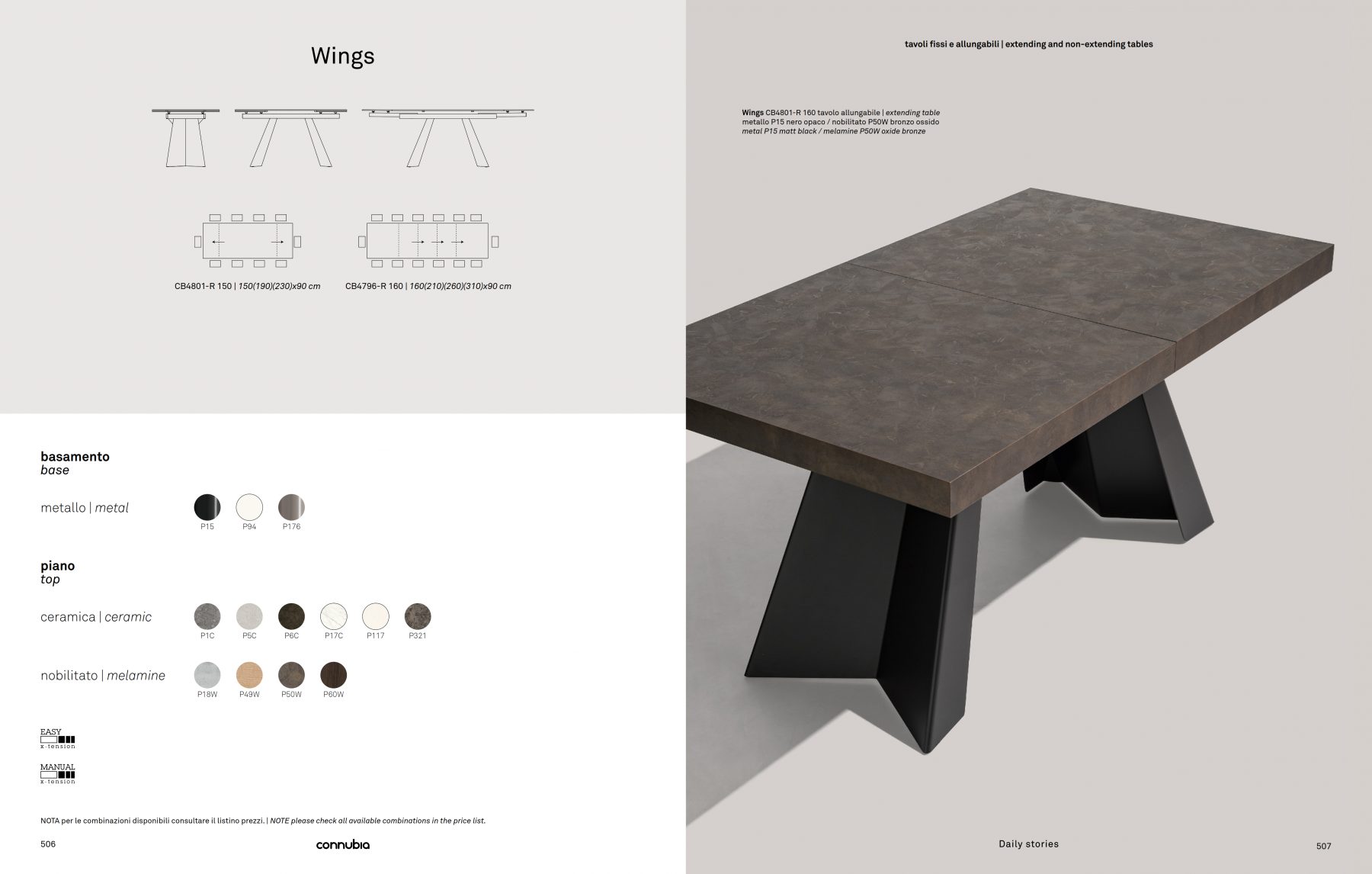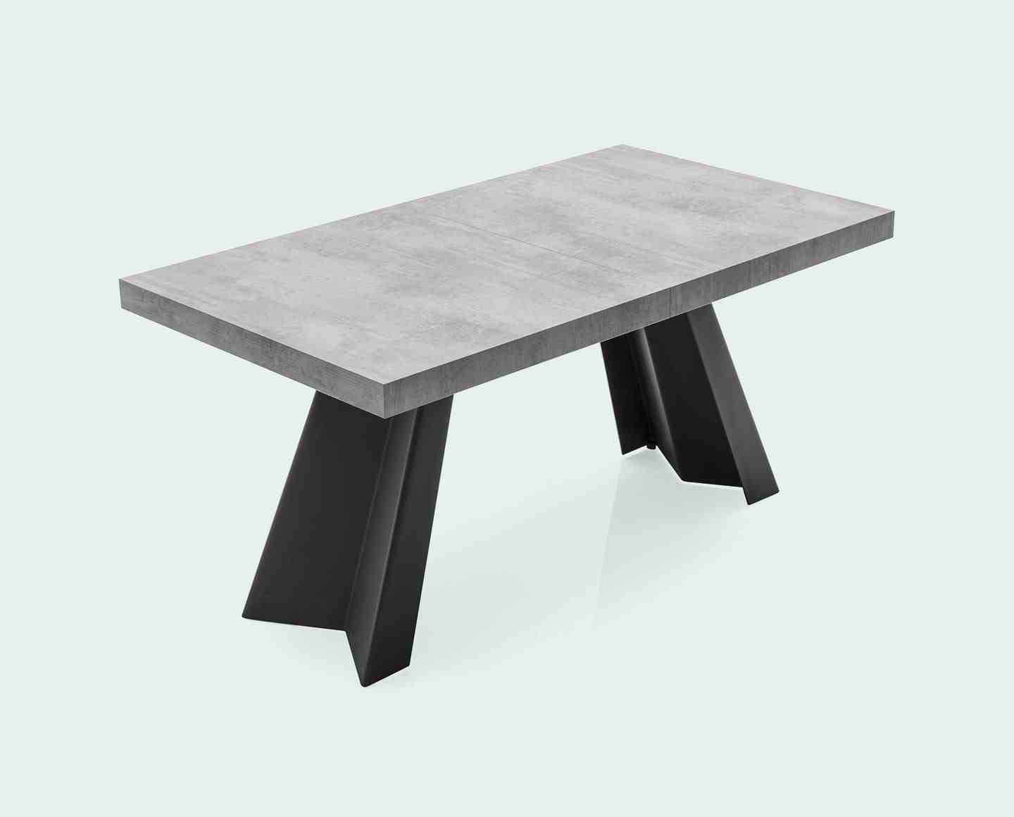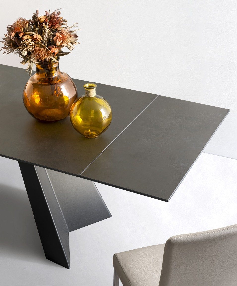 Extendable table with metal frame, having a bold and eye-catching design, made of wing-shaped folded metal sheet. It features a ceramic top with two separately openable side extensions and fixed wing-shaped legs made of folded metal sheet.
