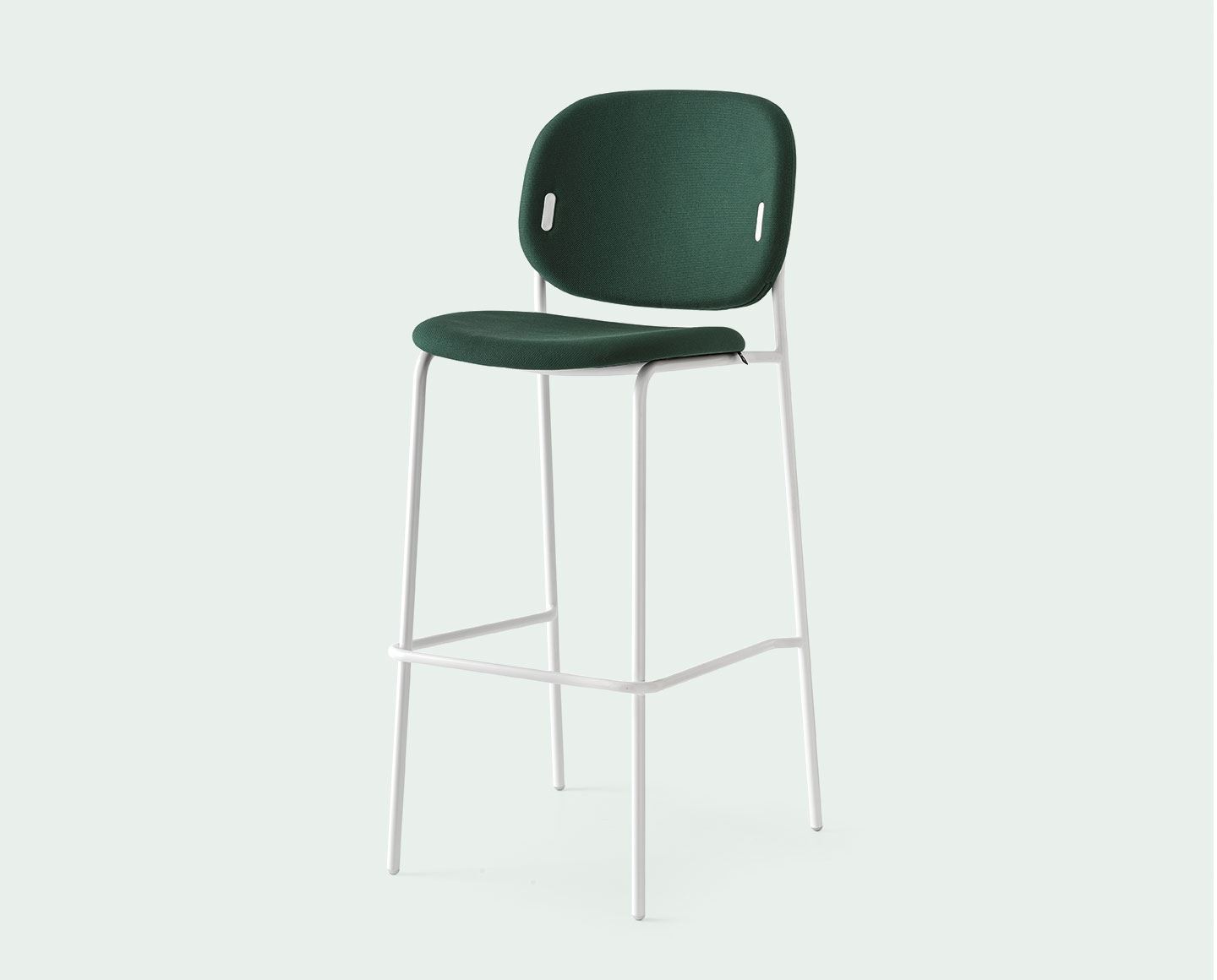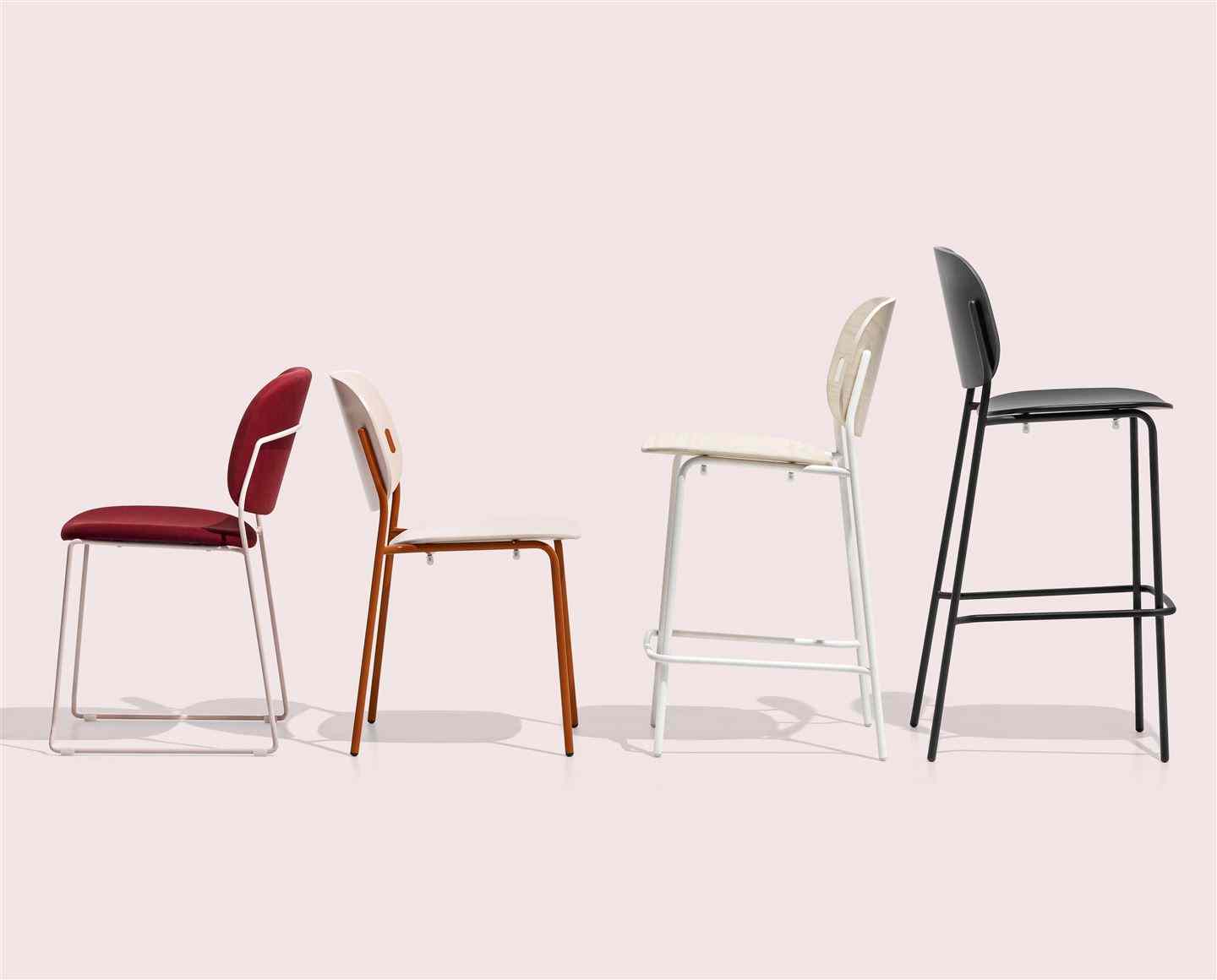 YO! Stool with seat and backrest either in wood, padded material or polypropylene. It boasts a standout backrest fastening featuring a colourful decorative plate attached to the surface and made to match the base.