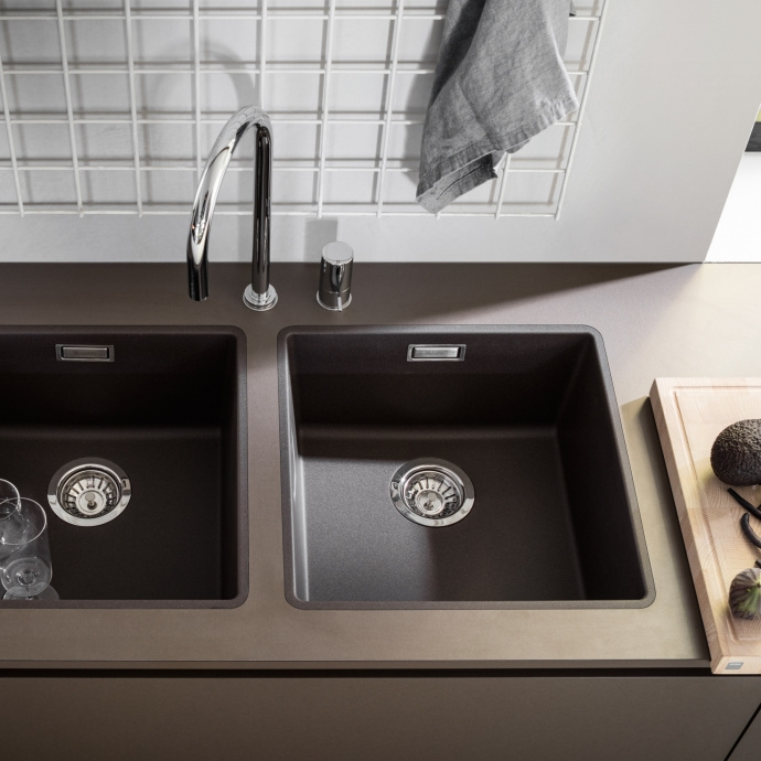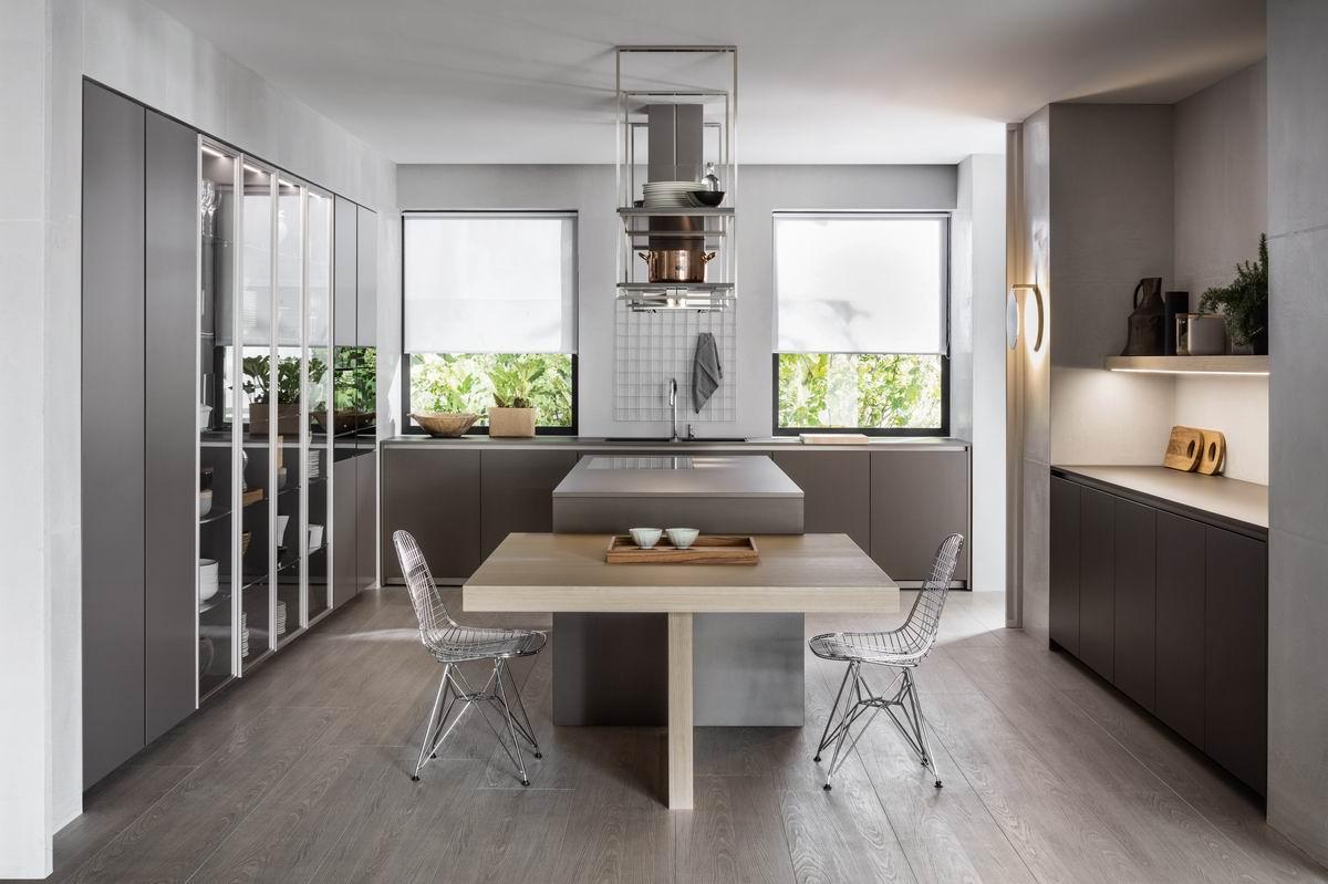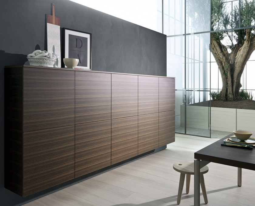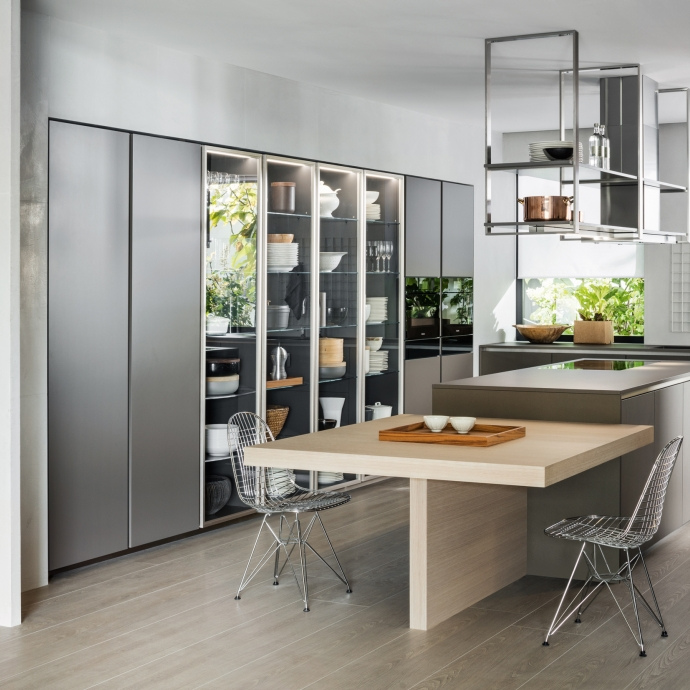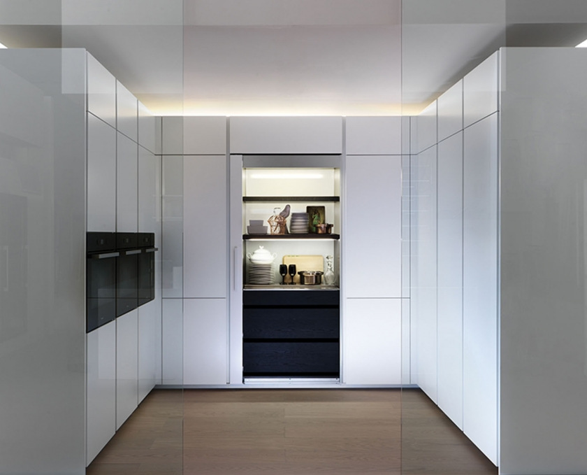 A unitary project, simple and linear: Hi-Line 6 is more than just a kitchen. It’s a space to live in. This space is organised with “esprit de géométrie” combined with rigorous shapes, richness of detail and care for quality in construction. The base units are taller, to hold more and better. Far from the classic concept of the kitchen, Hi-Line 6 allows for several composition options. No handles are used – instead there is a finger recess to open and close the doors.