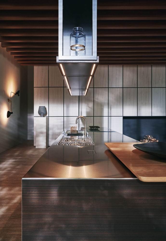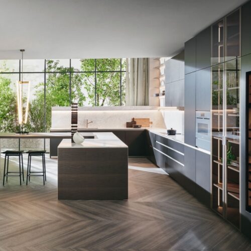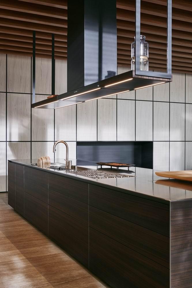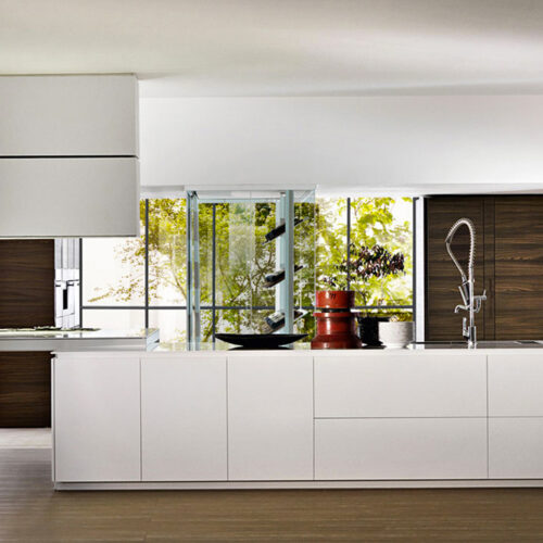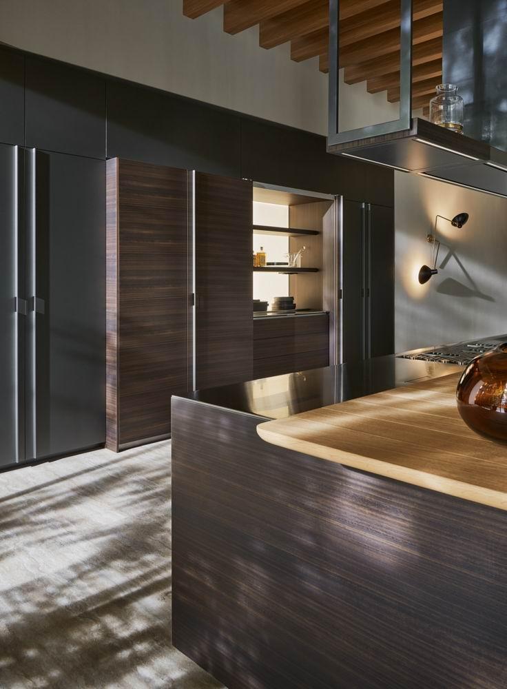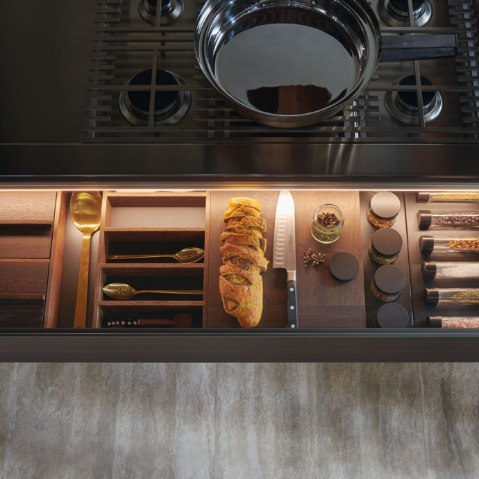 A simple, unitary, linear design which, in 2018, is embellished with the new Frame Door. Frame made of titan aluminium and pewter, with a selection of quality finishes for the fronts. The top of the door is shaped to ensure an ergonomic grip.
