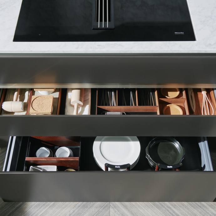 Prime is designed to express the full potential of a kitchen featuring recessed opening. It comes in a range of different compositions designed to meet the most sophisticated aesthetic demands. The finger recess runs seamlessly the length and breadth of the product and ends on the side panels, an alternative solution to the finished sides, offering ample scope for personalization.