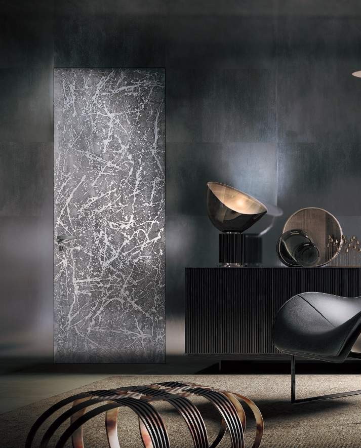 Xite zampilli frameless door, lined on both sides with an etched aluminium sheet.